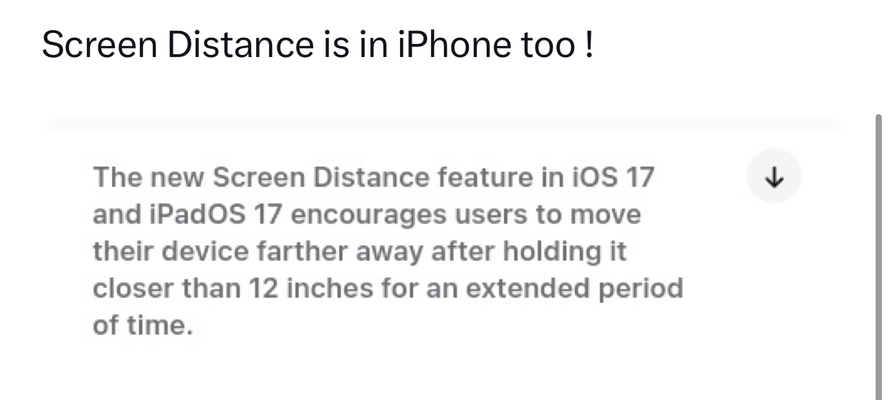 I found it funny how they released this feature and a headset that is literally 2 screens right in front of your eyes in the same keynote.Screen Distance is on iPhone now. Great the kiddosProtect them gorgeous eyes of yours.