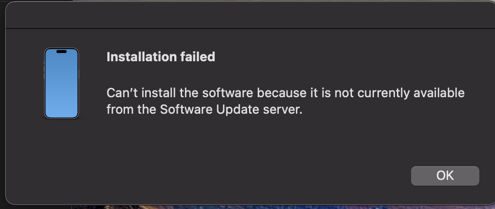 I had that error message, but it seems it flags that erroneously, as it then worked for me.I toyed around with restoring my phone and going back to iOS 16 but once I connected my iPhone to my Mac I was told that software was needed to be downloaded to recognize my phone. The download was attempted but then came back with an error saying the software could not be found on the server.