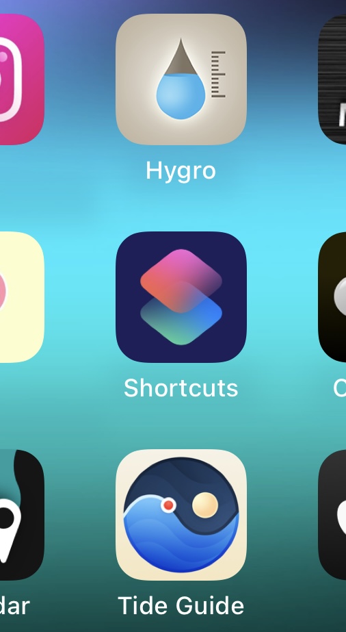 Shortcuts, awesome icon, below it one of my favorite from Tide Guide, simple and good looking, above them Hygro, looks great.