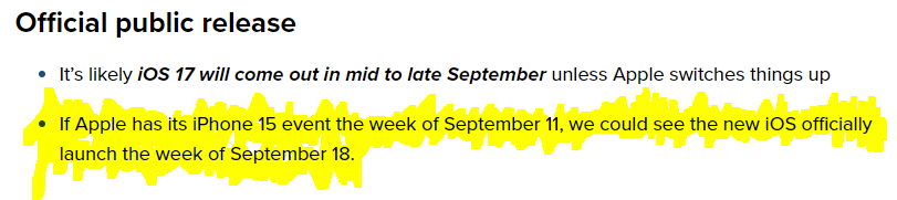 If they follow the regular schedule then the iPhone announcement will be on the Tuesday of that week. And the first day to preorder one will be on that Friday. IOS 17 will come out the next Tuesday with the iPhone available on Friday.