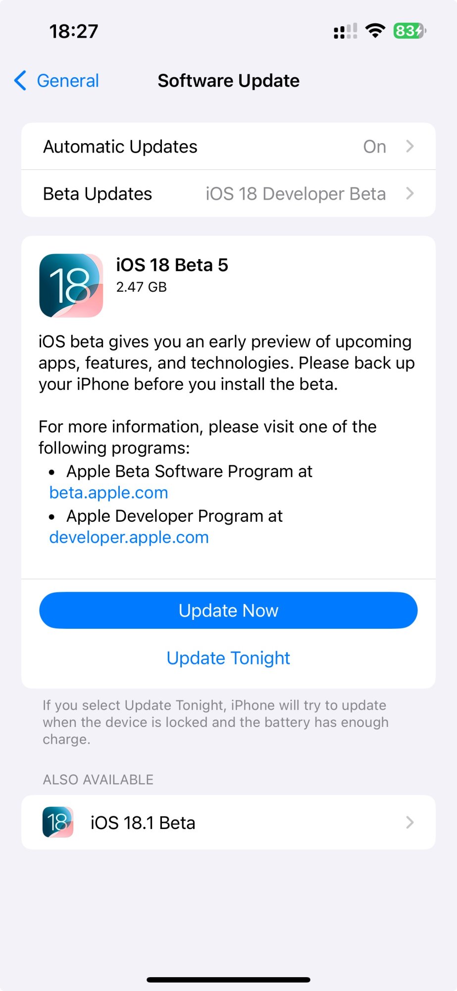 Not showing for me either.I’m on 18.1 my watch is on watchOS 11 and I can’t update my watch, the beta 5 update isn’t showing. Has anyone experienced this before?
