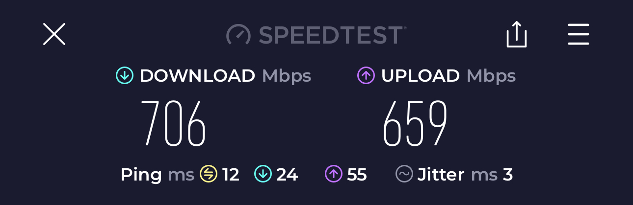 What equipment do you have? I’m running wifi6 mesh. Most I hit in iPhone 15 pro max is around 600 up and down on symmetrical gigabit fiber. On Ethernet I’m like 980 up and down.View attachment 2405811Wifi is normal for me, getting the usual speeds.