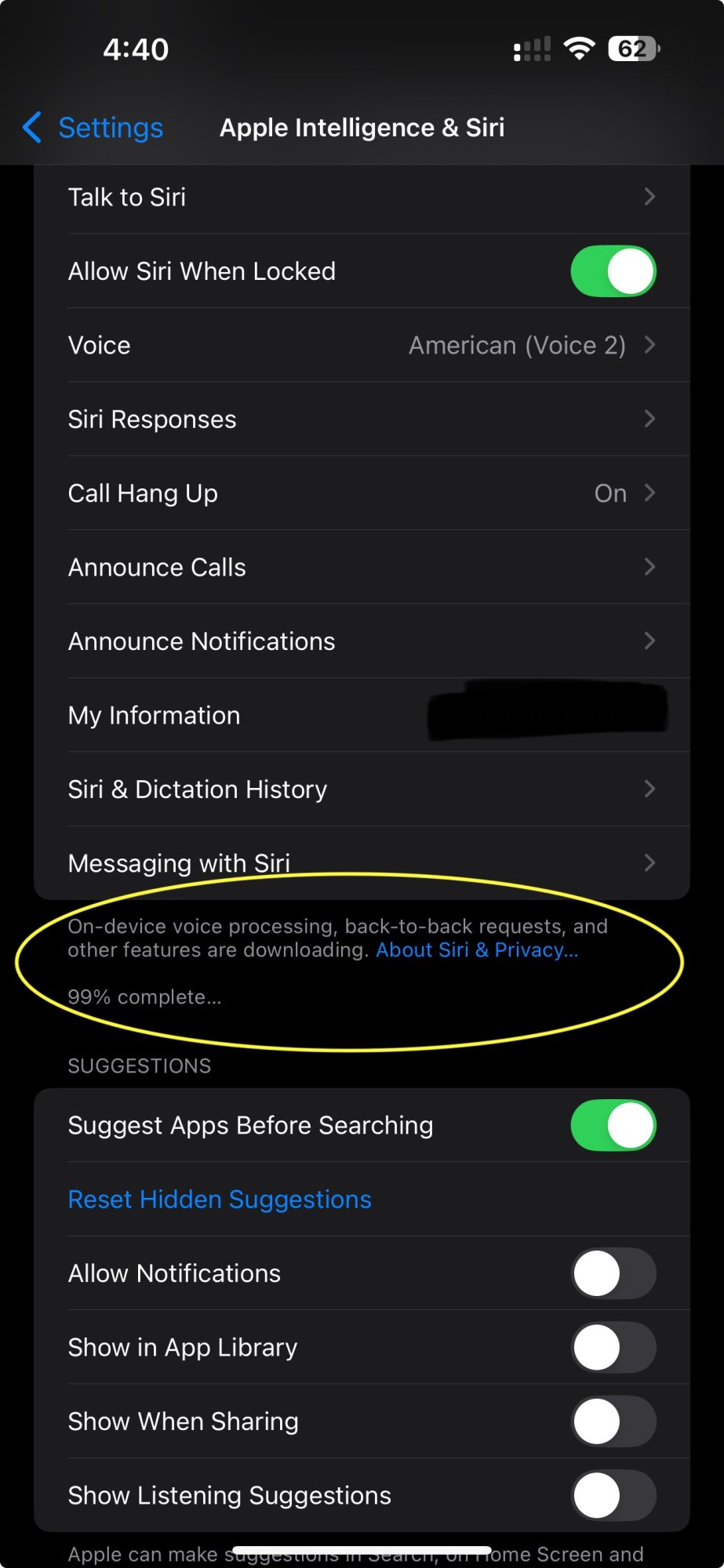 Ditto, same result with AI off. SIRI now works.It still states “downloading” even with AI turned off..