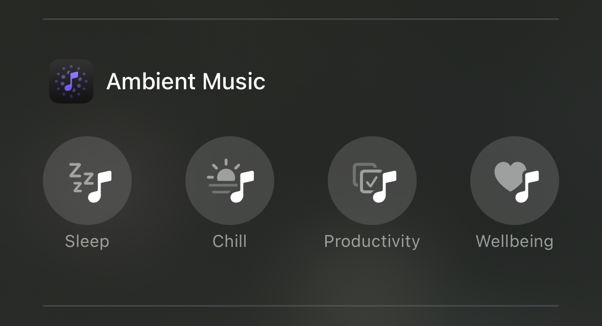 So it’s an app that plays music playlists but it’s totally unrelated to the Music app? Aren’t these icons basically shortcuts to playlists?It is its own separate app completely unrelated to Apple Music that just contains the ambient playlists.