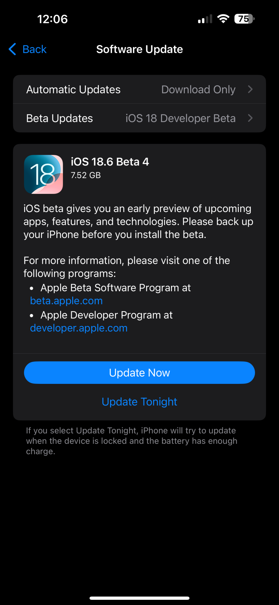 roncron said: Macrumors says the 18.6 RC was just released to developers. However, it shows up on my phone as 18.6 Beta 4: View attachment 2530555 Click to expand... Same here on 16PM and 7.65 gb