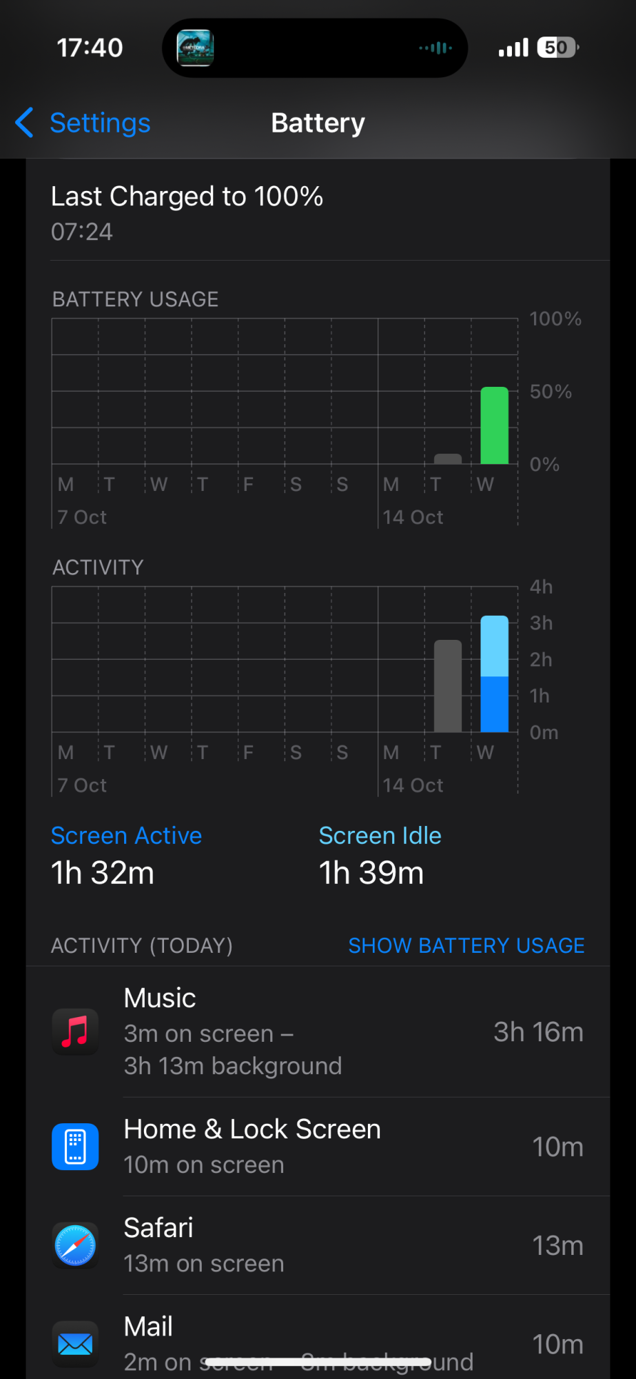 Yeah, I use Apple Music streaming via Wifi since I’m at work. However, 3 hours of music shouldn’t eat half your battery… it’s literally all I’m using this phone for right now. God forbid I install social media or a game!Do you stream music with Apple Music or offline usage only?