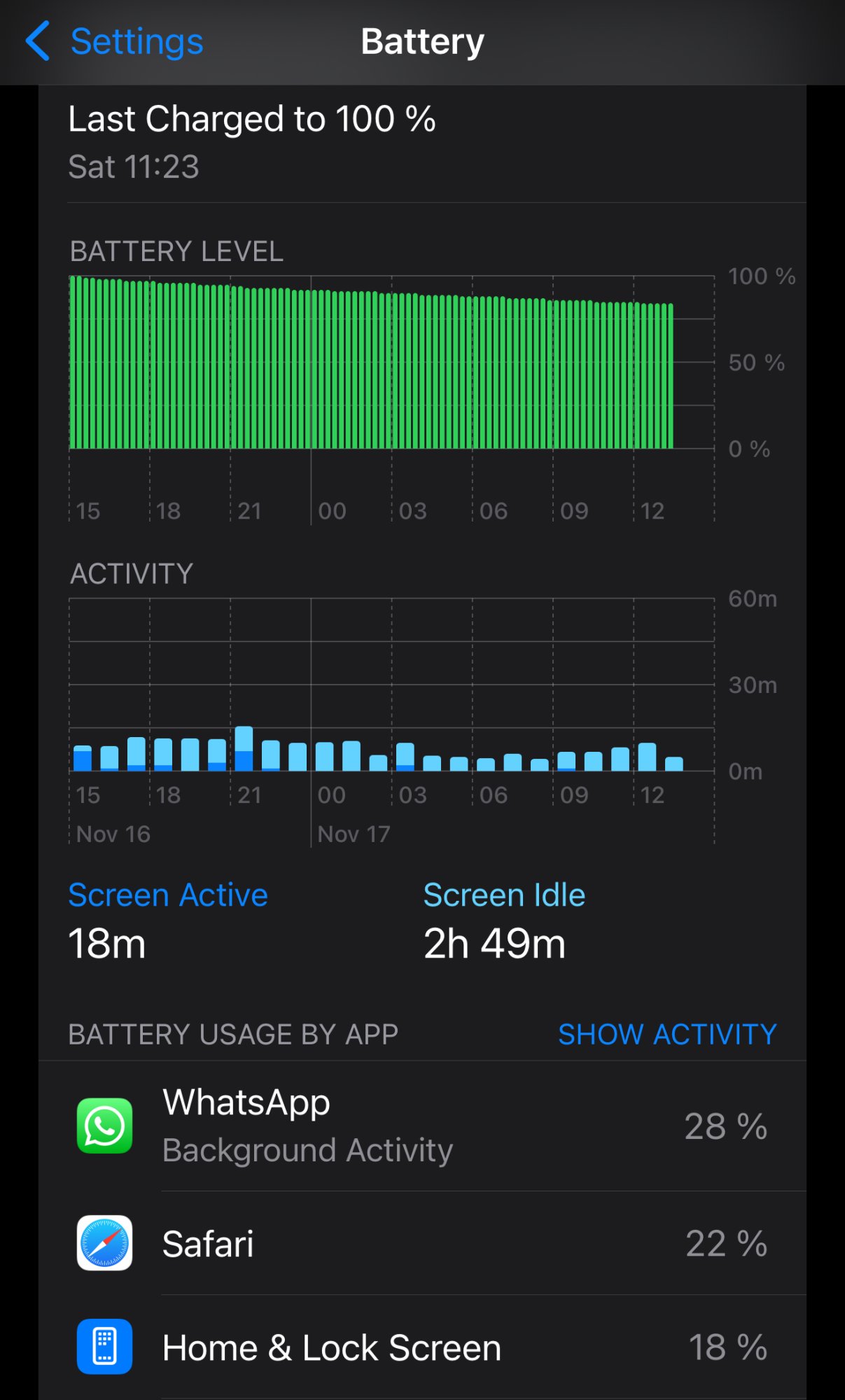 So far I have 2 hours of screen on time and haven’t even hit 20% drain. Yesterday I had 2.5 hours of screen on time and 70% drain on my old 16 pro.