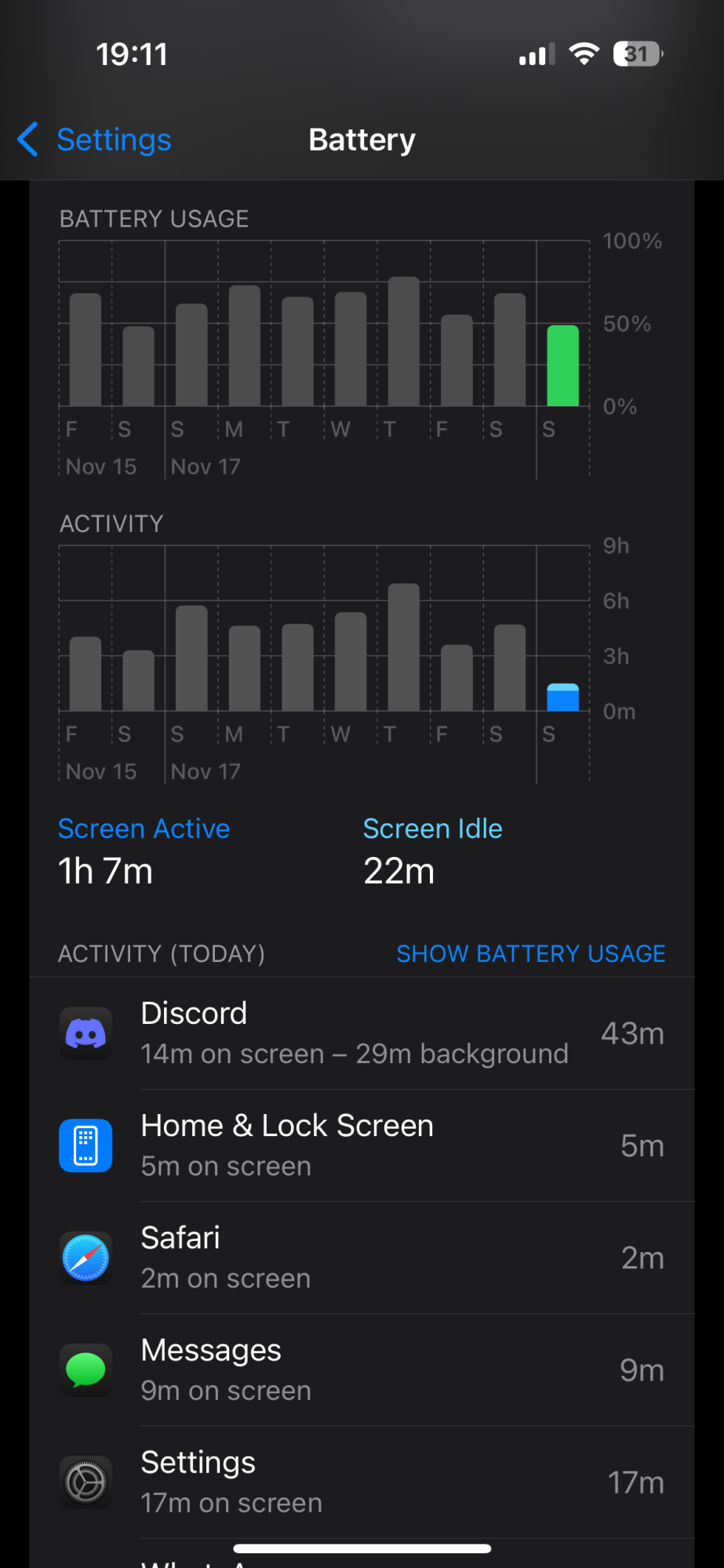 As you guys can see, half of my battery flew out the window in exchange for 1 hour and 7 minutes of screen on time. The only 'crazy' app I've been using is Discord, and even so, only for 43 minutes.