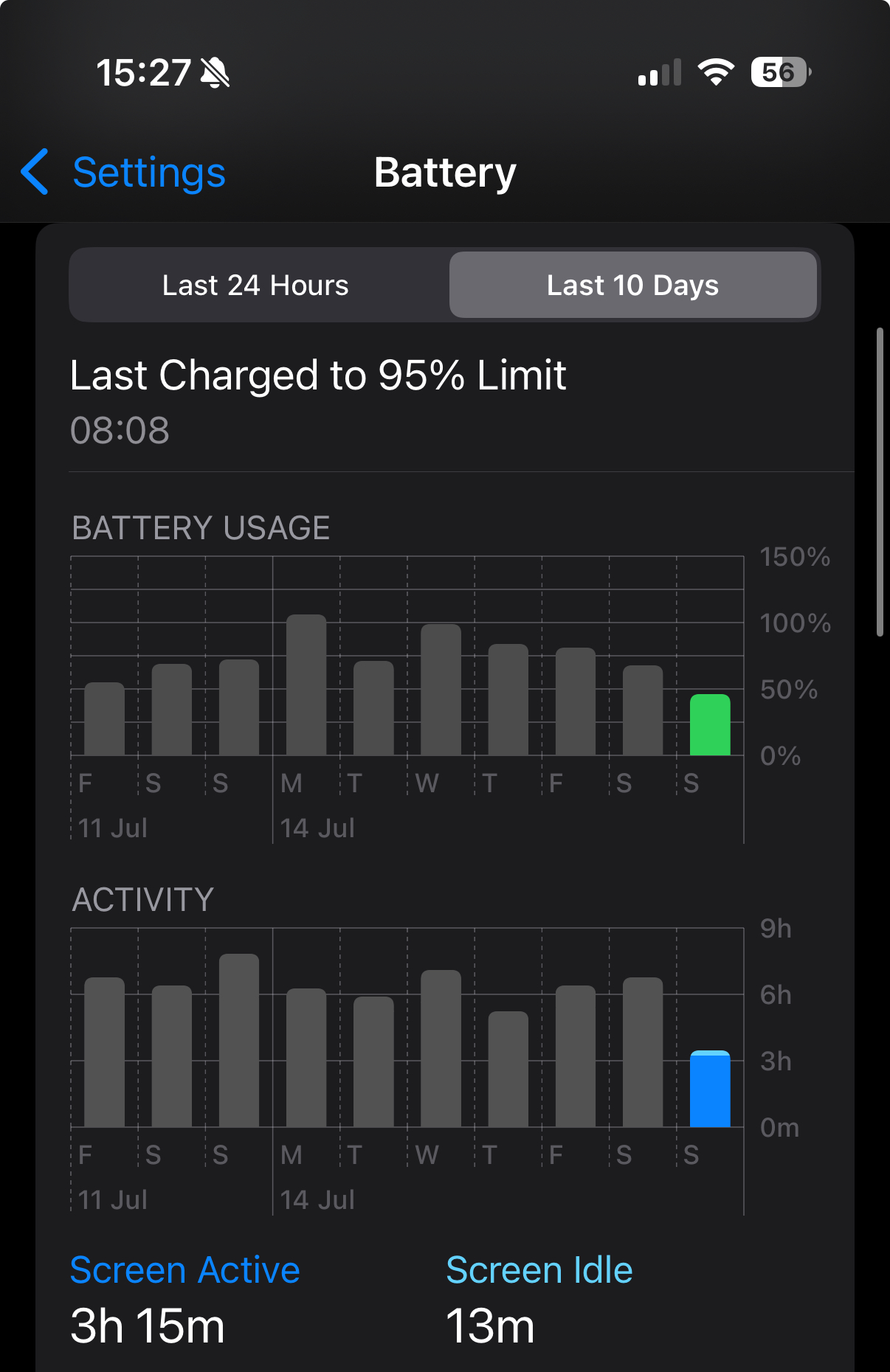 It randomly comes and goes. It started a couple of months after I bought it (it did NOT happen at the beginning, I got my 16 Plus back in March), and it never really went away. And it is magical. Not only does it appear randomly, sometimes it is weird. Say, it appears overnight at the 4:00 am-5:00 am bar for 23 minutes, and then stops. Randomly and inexplicably. I’m sleeping at that time and haven’t touched the phone. I wake up at, say, 6 am and I just have those 23 mins from 4 to 5 and nothing else. I haven’t really found a solution.