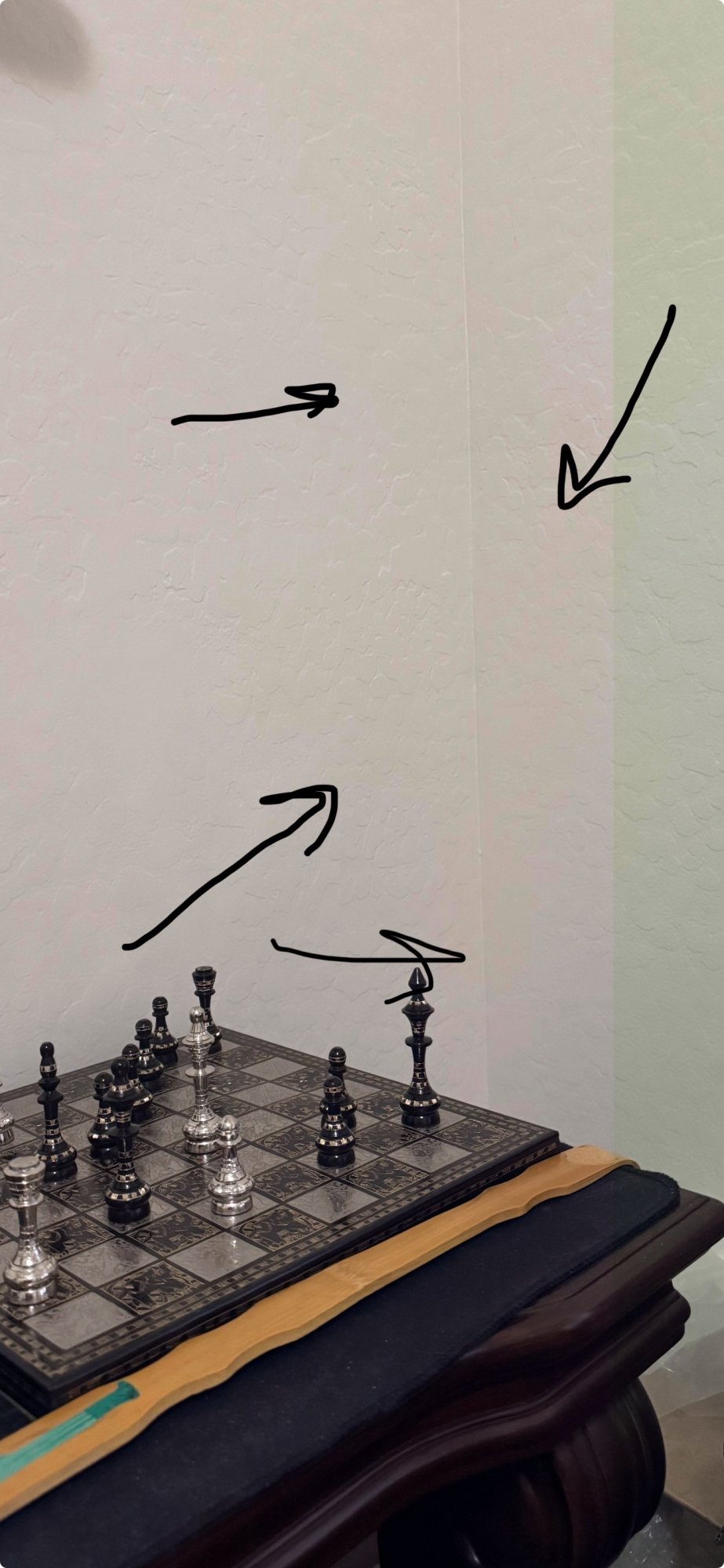 See pic below and look at the wall where it meets. Not sure what the blemishes are. They are new. Btw - walls are white textured with lighting by overhead 40W cool led bulb.