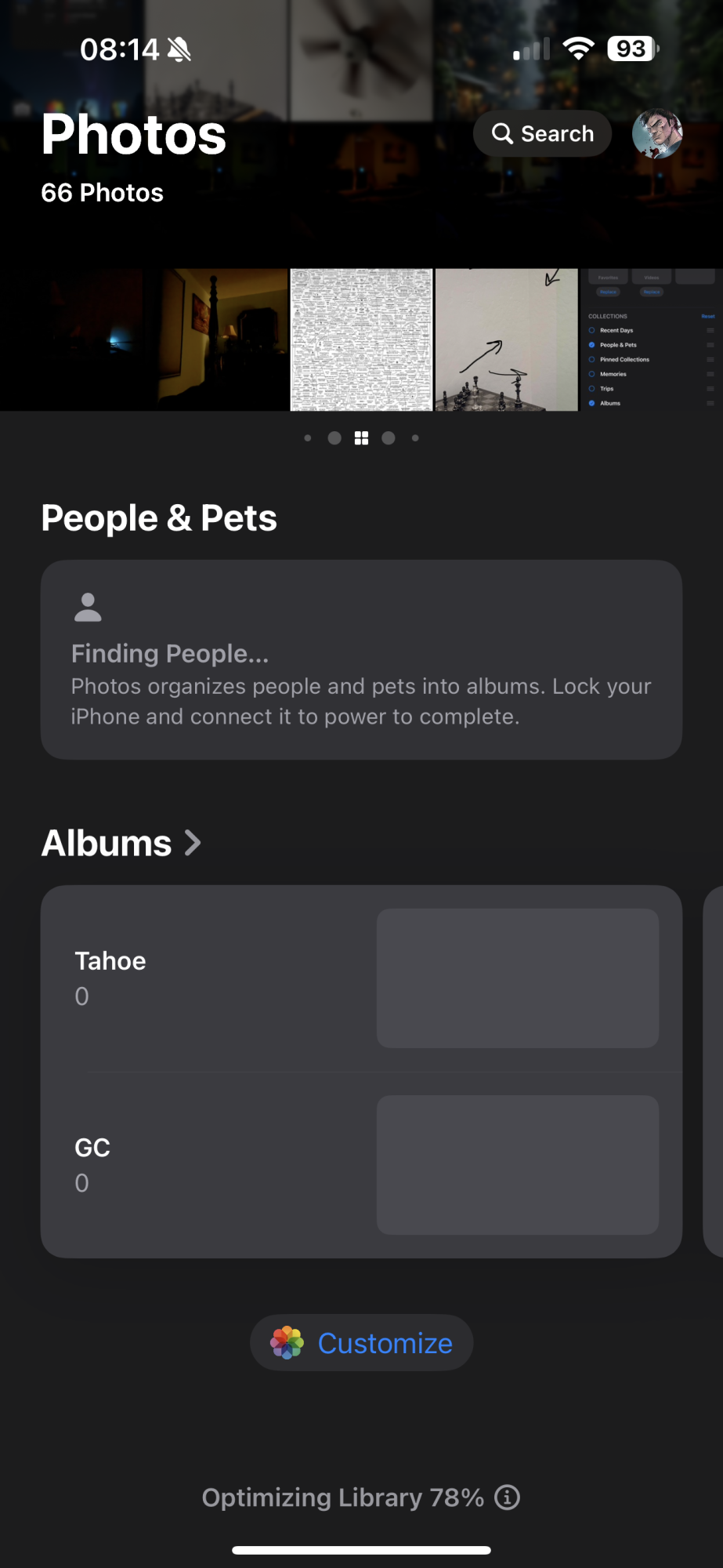 Note the Optimizing Library % at the bottom. What? I only have 66 photos at present. I do not have iCloud Photo Backup on.
