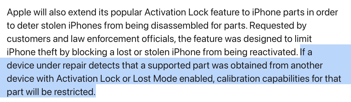 Sure, but it decreases the value of stolen parts by making them harder (more expensive, due to technician time requirements) to use. This doesn't fix the problem entirely but it makes substantial strides. Reducing the incentives to steal phones will have meaningful effects.Lots of parts will be ended up at repair shop. If you know repair technician in China or anywhere, you can circumvent this easily.