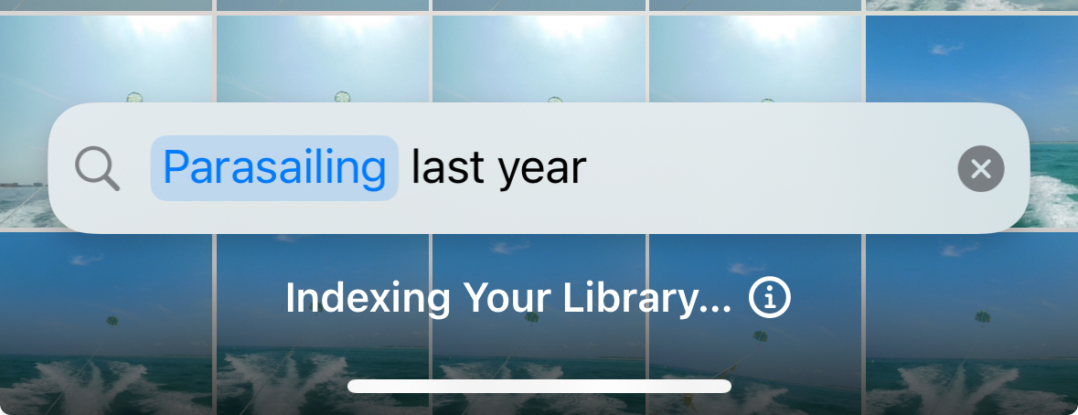 as far as i know, similar to curation, the indexing would be completed if you leave your phone connected to power and stayed overnight.When I type a search into the Photos app, the results screen indicates that indexing is still running: