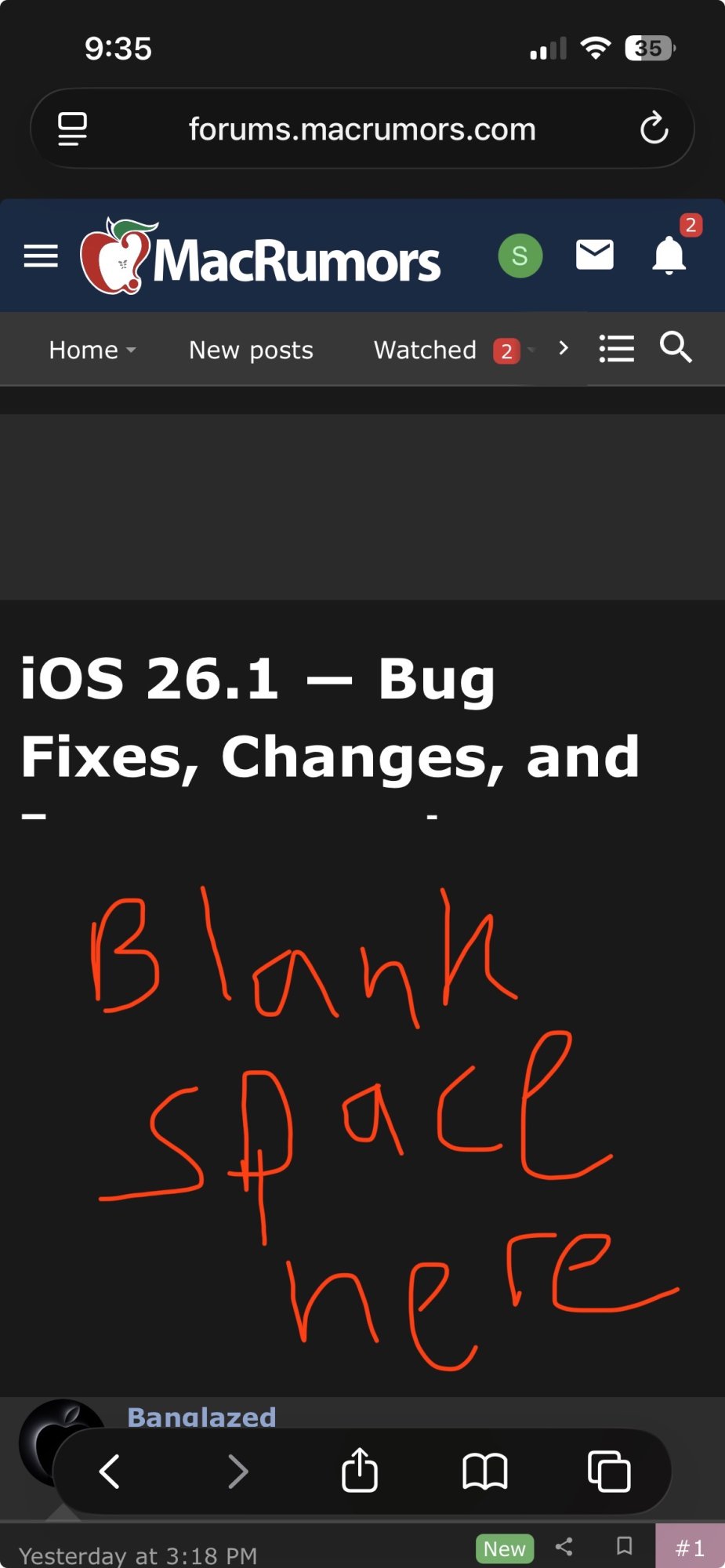 So annoying with safari this blank space on web pages. It’s also on Firefox. Makes web browsing many pages nearly impossible. If you scroll all the way to the top or bottom of a web page, the blank spots go away. See pics. Started in 26.0.2.