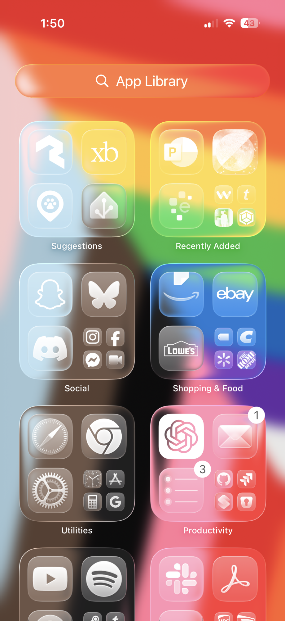 And use cases like the control center are where this new style falls apart. The white control center icons/sliders lose their edge contrast against white backgrounds. Also the background color refraction effect seems a little heavy handed:Here’s one of my home screens! I’m really excited about the clear glass icons and light mode tinted icons. I always was sad that iOS 18 only allowed dark tinted icons. This update feels so much more “me” so far.