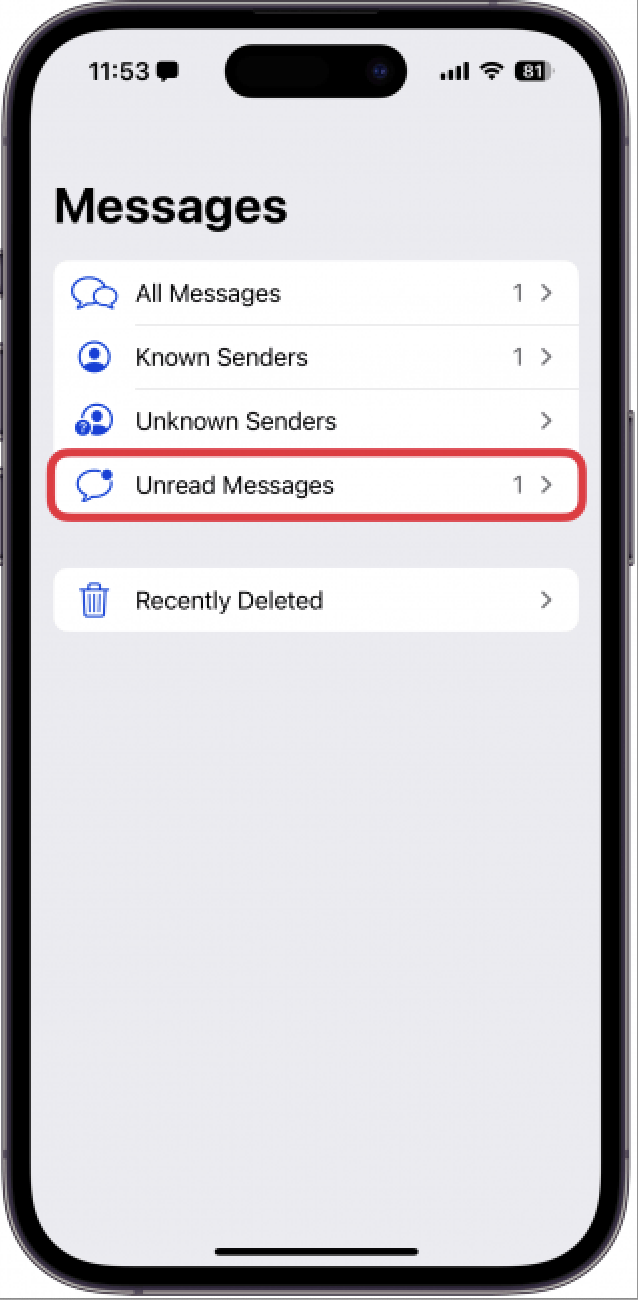 There's a Filter section that you can access by tapping the icon at the top right of the Messages app interface that will let you see messages with specific content. Options include Unknown Senders, Transactions, Promotions, Spam, and Recently Deleted.