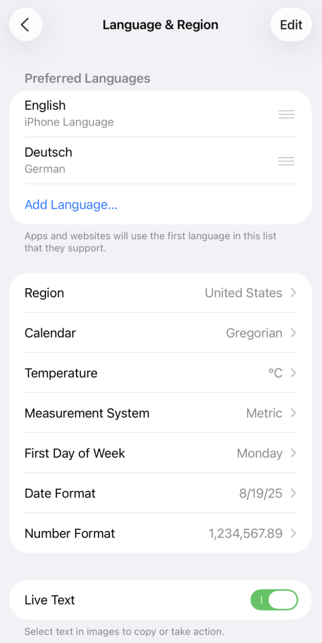 2. Ensure iPhone Language and Region are set to the same, i.e. English (US) and US or German and Germany (DE)
