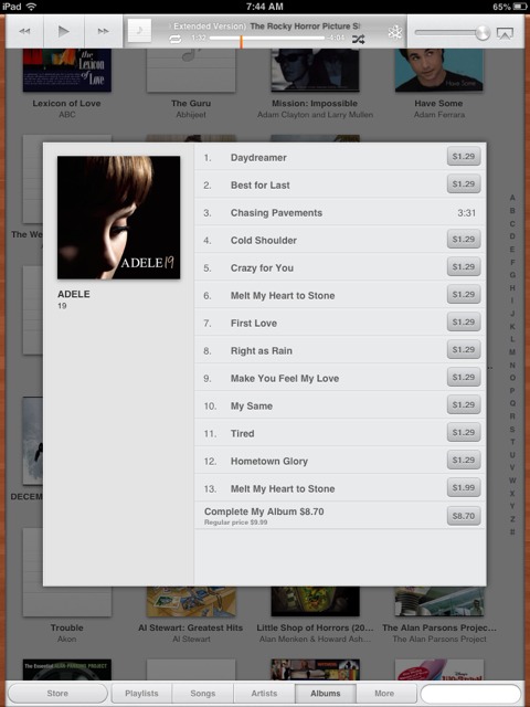 Just noticed this: go to Music, to an album where you've bought only some of the tracks . The app will offer to show you the rest of the album allowing you to buy additional tracks or "Complete my Album"