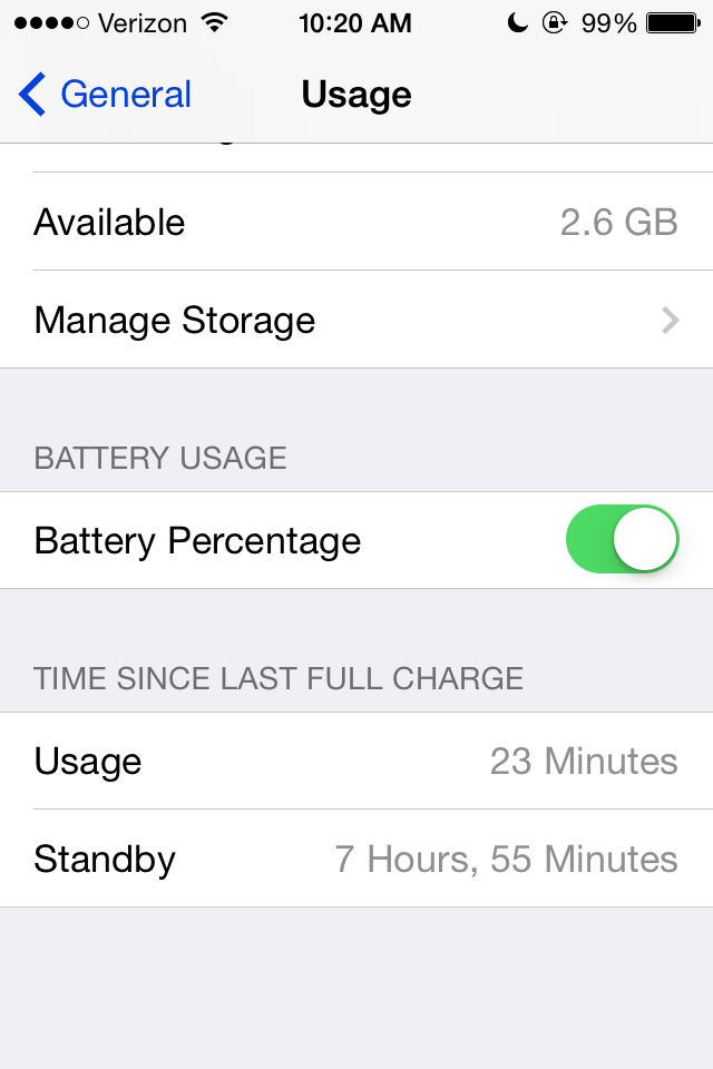 Generally speaking (on iOS 7.0.4-7.0.6), if my phone is on my desk, and I'm not using it (only receiving emails from one account) it'll drain maybe 1-2% in a couple hours (this is assuming I am not in a texting conversation). After updating to iOS 7.1, I messed around for 5 minutes or so checking out what was changed (animations, etc), and then I put my phone back down. The next couple hour period it had drained 4%, doing nothing different. After a few hours I noticed this was a constant thing, so I charged it fully to see if it needed to re-calibrate or whatever.