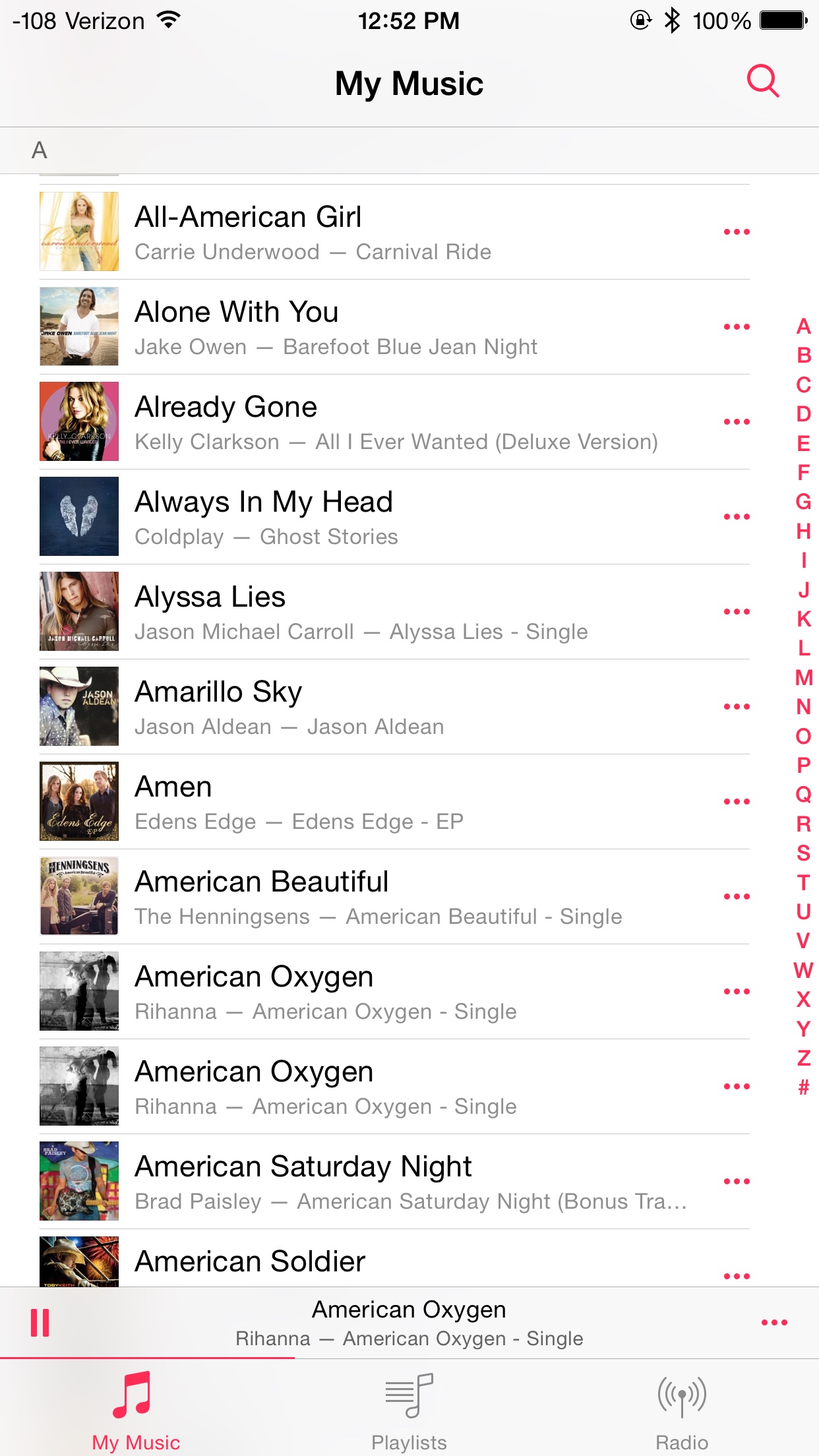 Notice how 'American Oxygen' is doubled up. Playing said track will display the playing icon with the little wheel on both entries. Quite interesting.