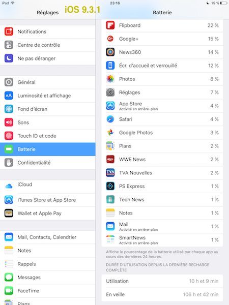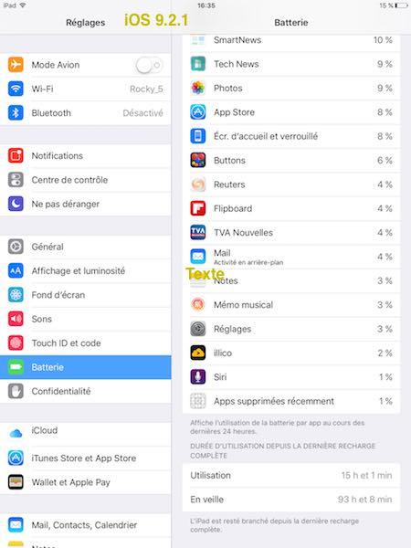 Hello, I've been late to the party but I finally updated to 9.3.1 after hanging to 9.2.1. In short and as I say in another post about my Airdrop problem concerning my Air 2 able to send files buulable to receive. After 60 minutes + with the Apple guy, was decided to update to 9.3.1 and set iPad as new. That solved my Airdrop problem but the other one I was concerned about, that is battery life being diminished, so happened and here are two screen captures to show it. Please comment and say something to poor me. First, here's my iPad story: this one is the third one, came with 8.5, upgraded to 9.2 and 9.2.1. Battery life was as it shows in the January screen, then upgraded to 9.3 that cut battery life in two, reverted back to 9.2.1 and battery life went up but Airdrop was down. As you can see, I'm losing 5 hours which is big time loss. What is there to do? I'm much fed up and this experience with an iPad is more or less of a disappointment.