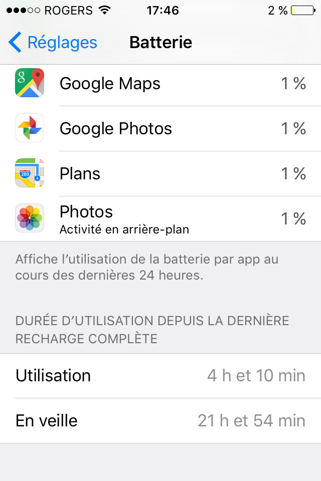 I don't read or speak french but it appears you may have plugged in your iphone and charged it between these results. What does that say beneath photos? Something about batteries in the past 24 hours? If so your numbers are skewed, meaning you got a higher usage because you plugged in and charged it to get a higher result.
