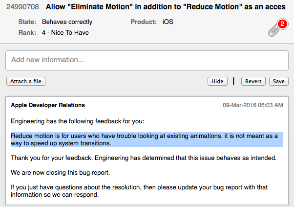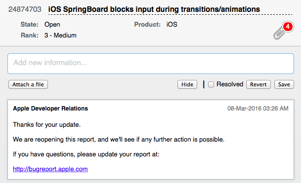 I have already sent a feature request about this on radar.If anything, it should be a feature request to make it a settings toggle. My devices are night and day different with the glitch implemented. My phone feels as responsive as my win 7 desktop(animations off as well) when switching apps.