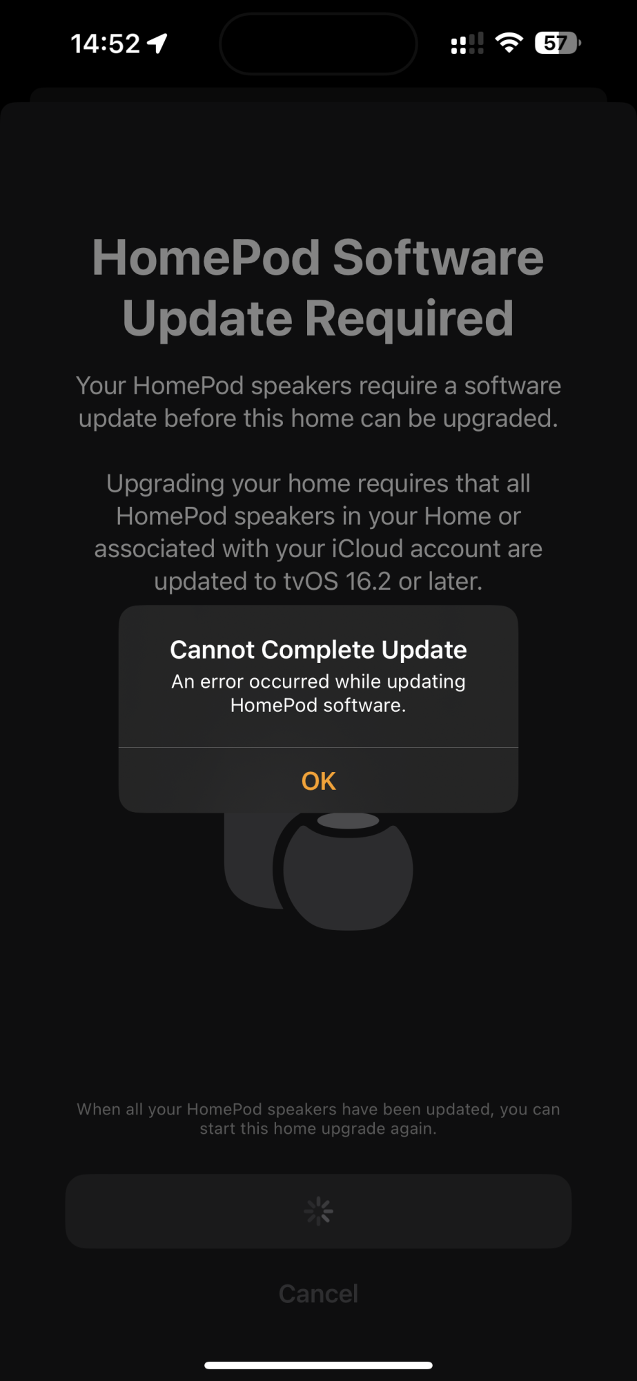 Upgrading your home requires that all HomePod speakers in your Home or associated with your iCloud account are updated to tvOS 16.2 or later.