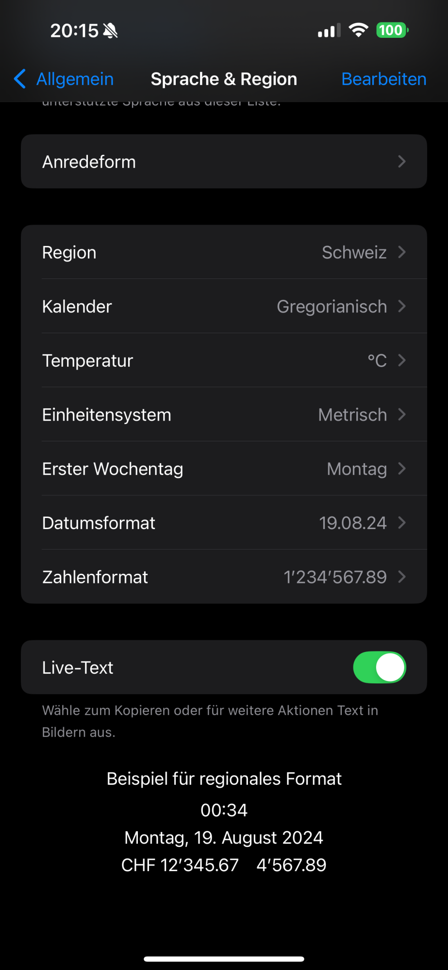 It is set to Switzerland, GermanWorks right for me. What language/region do you have your phone set to?