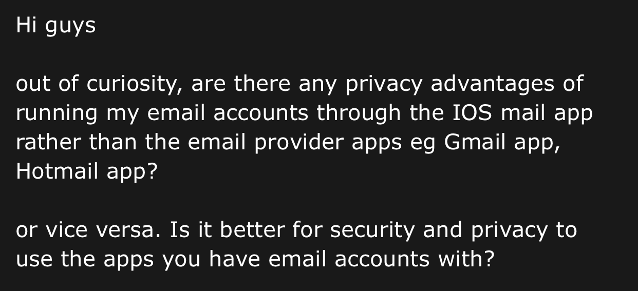 out of curiosity, are there any privacy advantages of running my email accounts through the IOS mail app rather than the email provider apps eg Gmail app, Hotmail app?