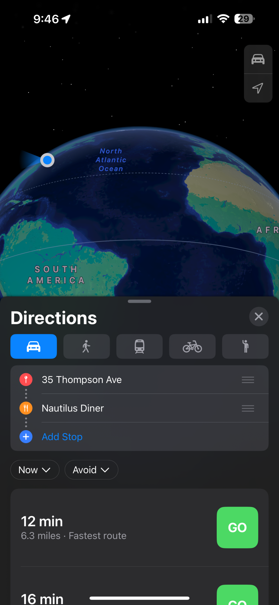 Maps is behaving strangely on my phone. I’m seeing European speed limit signs for speed cameras, and whenever I load a previous destination route, the camera zooms out to the globe and sends me to…well, take a look below!