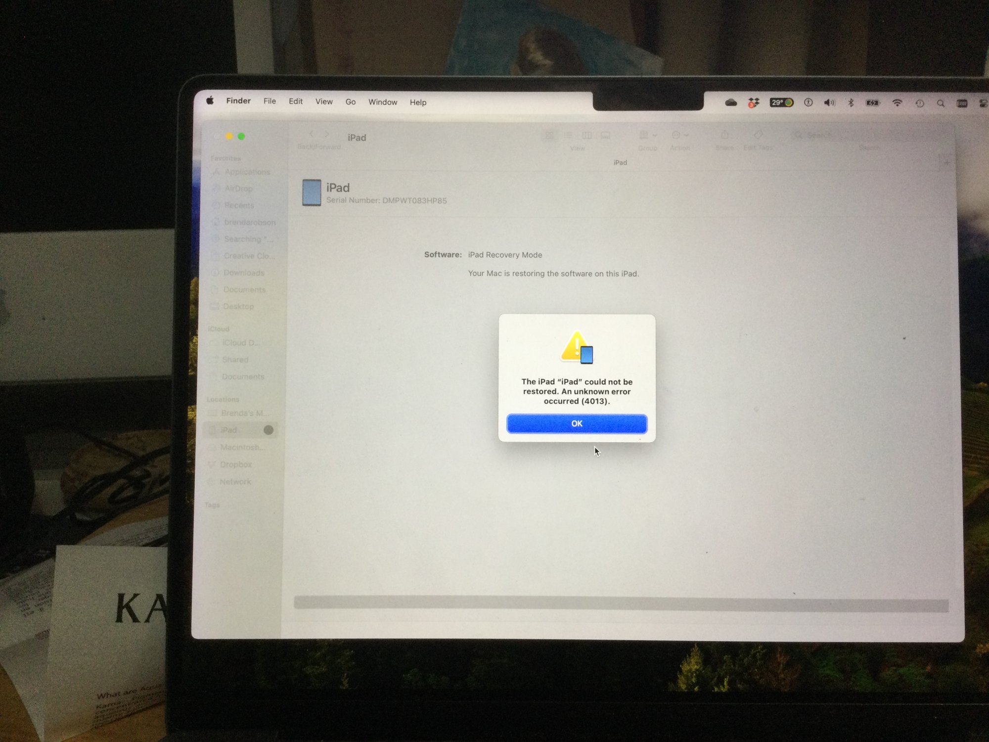 2019 iPad Pro updating older macbook air to try it on that. Tried different cords, ports. Updated regular year old MacBook Pro to Sonoma to try and restore my IPad Pro