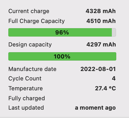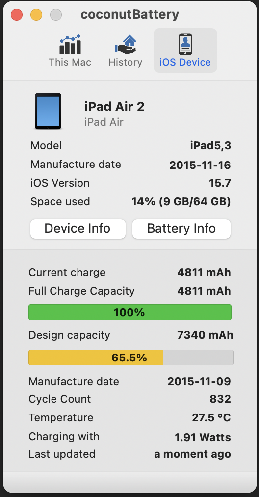 Regarding iPads and capacity: I know that it depends on usage. I know that it depends on a million factors (charge patterns, temperature, and a long list of etc that you already know), but in my experience - and most importantly, unlike iPhones - I’ve never had a single iPad reach that spec. Once again, yes, it depends on a million factors, but the vast majority of the iPhones I’ve had - if not all - (and the ones I’ve been able to check) were well within spec, even when usage and charging patterns varied wildly. iPads... not at all. My iPad 4 had 77% after only 530 cycles, and my 9.7-inch iPad Pro has 84% after about 650. A family member’s iPad Mini 1 now has over 1000 (1050 I think) and stands at about 70% health. Check the OP’s Air 2: 65% health after 832 cycles. Yes, battery age is a factor (and as iPads have better battery life, it takes longer to get to very high amounts of cycles), but iPhones retain health a lot better! My iPhone 5c has over 1000 cycles (must be close to 1100) and it is above 80% (twice over spec), my iPhone 5s on iOS 8.2 (with a broken screen, pain) has about 800 cycles with 85% health even after almost 8 years (it is now unused in a drawer). So, even comparably old iPhones retain health better. I asked here about that once, three years ago, but I didn’t get many high cycles replies: