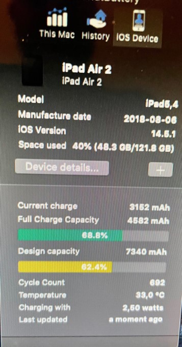 I've had my iPad Air 2 for several years and used it a lot. Recently I noticed that the battery life was starting to decline (750 cycles).