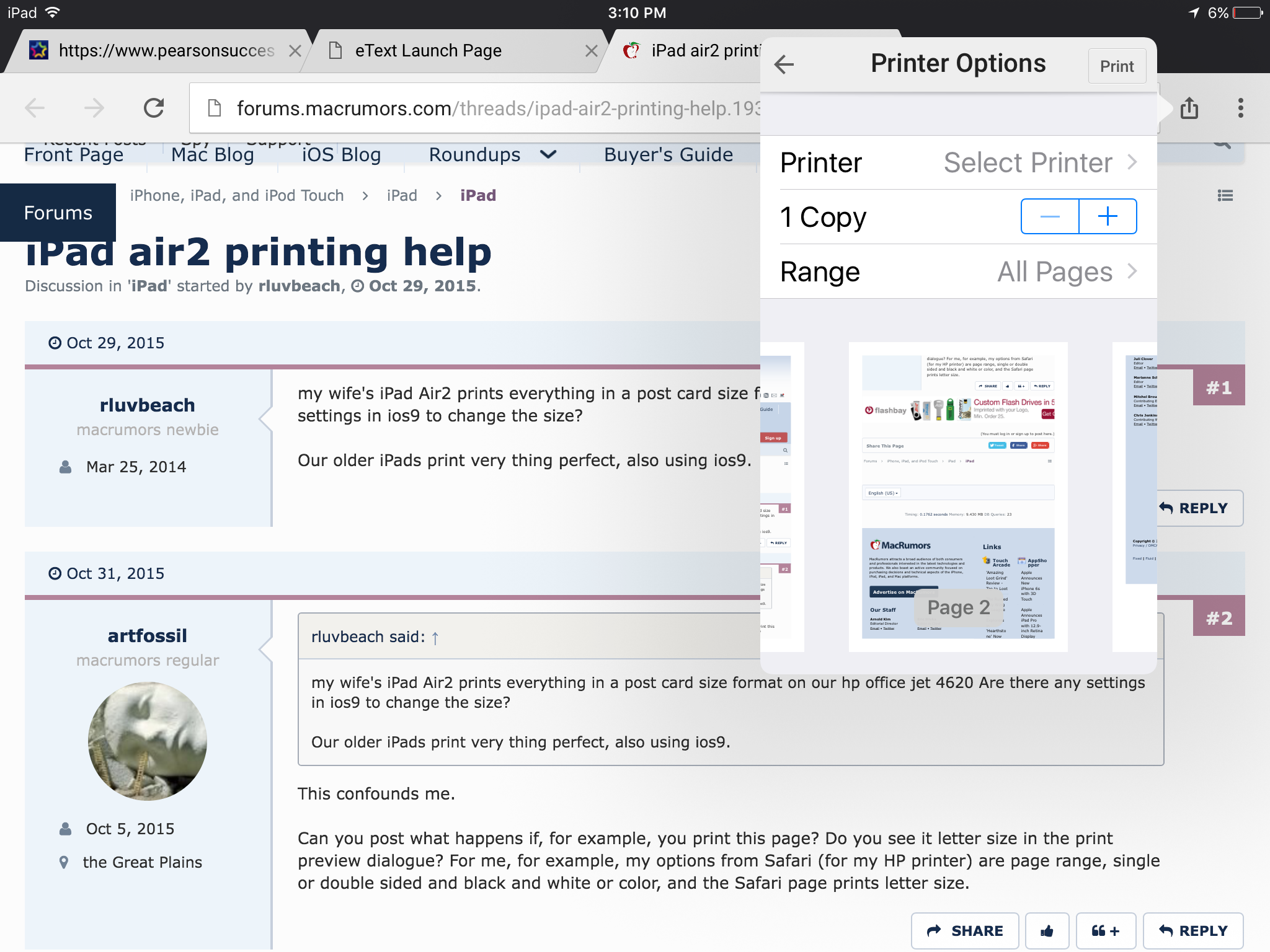 my wife's iPad Air2 prints everything in a post card size format on our hp office jet 4620 Are there any settings in ios9 to change the size?