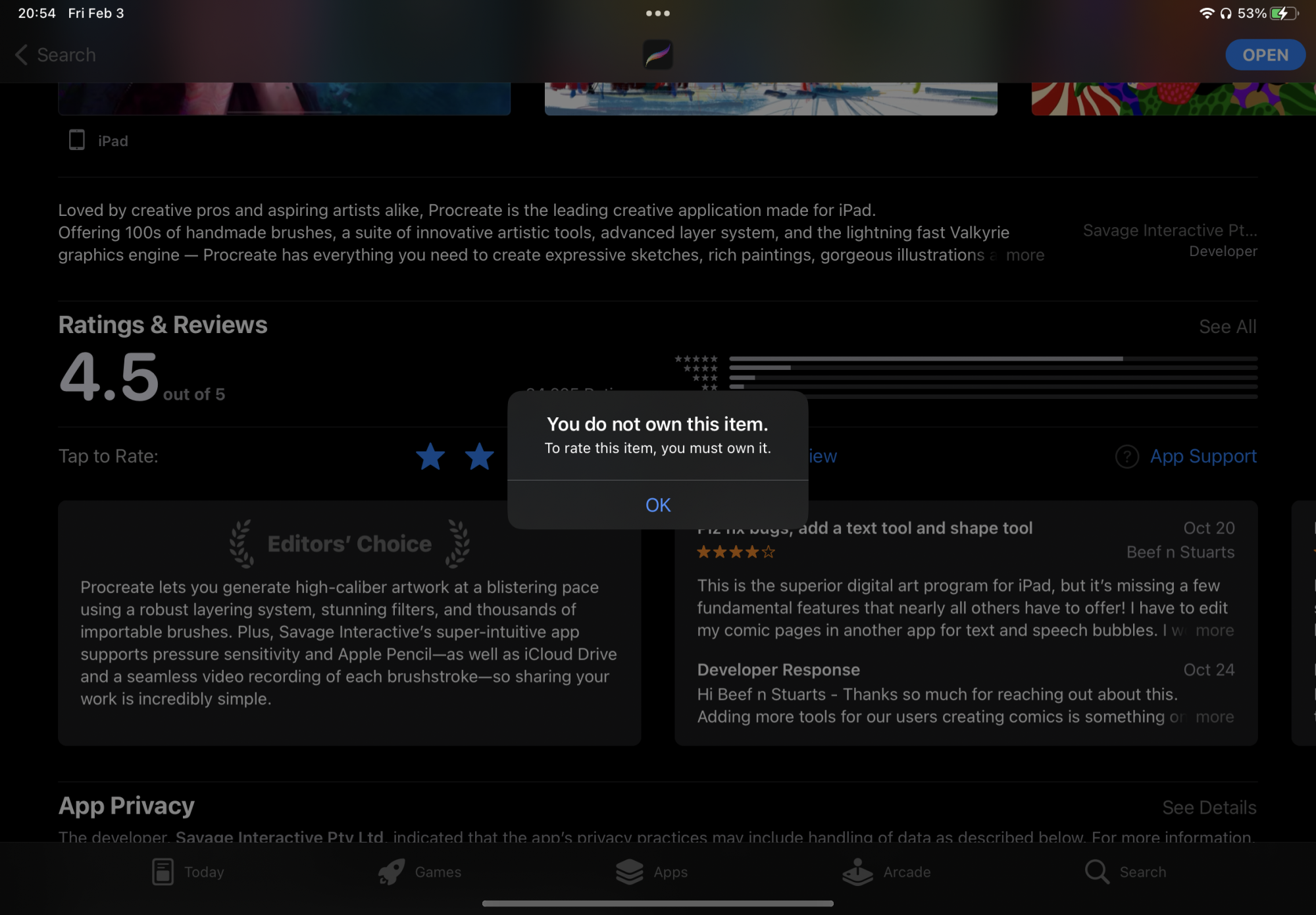 Attached is a screenshot of me trying to review it, as you can see in the upper corner it says “open” and not the price of the app, indicating that i own the app.