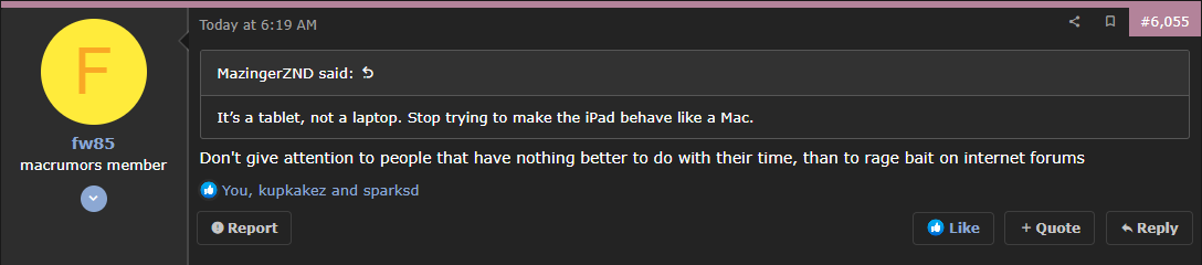 To go back to your earlier quotes from the person being accused of being a troll, notice how it unfolded last night. In response to a polite post from someone saying how they couldn't believe they weren't using the MacBook because of how nice the new iPad with MK was to use, (s)he said iPad didn't have Preview and so "can only act like a laptop". I pointed out that it doesn't have an app called Preview, but it has the same functionality regardless and asked if there was any specific features they were looking for but couldn't find, and mentioned an app that was built to more accurately mimic Preview on iPad. @bondr006 took the trouble of recording a video demonstrating that functionality. And then the troll deviated, seeming to gloat that the app was, in fact, an app rather than native. Three separate times of asking "what features are you looking for?" have all gone ignored.