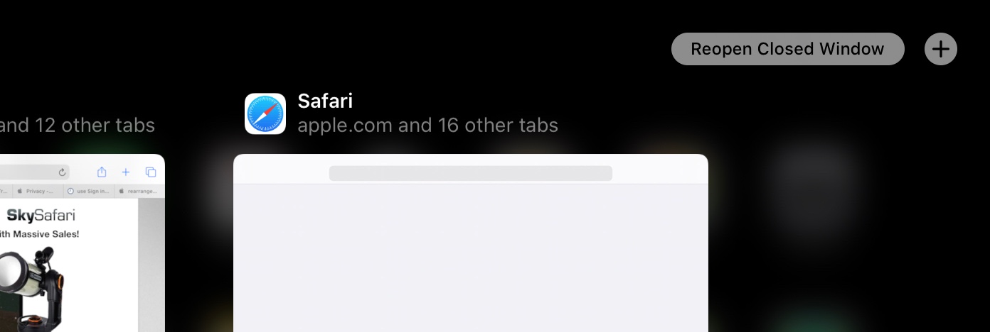 And @Webcat86, I looked more into it because I thought it was interesting, and apparently there is supposed to be a way to recover Safari windows. If I remember the steps correctly, you hold press the Safari icon in the dock, select “show all windows”, and this should be visible at the top right if some windows unexpectedly closed recently. I haven’t had a need to test it myself, but I thought you may find that useful. 👍🏻. I thought it was pretty interesting. 👍🏻View attachment 2457298View attachment 2457297