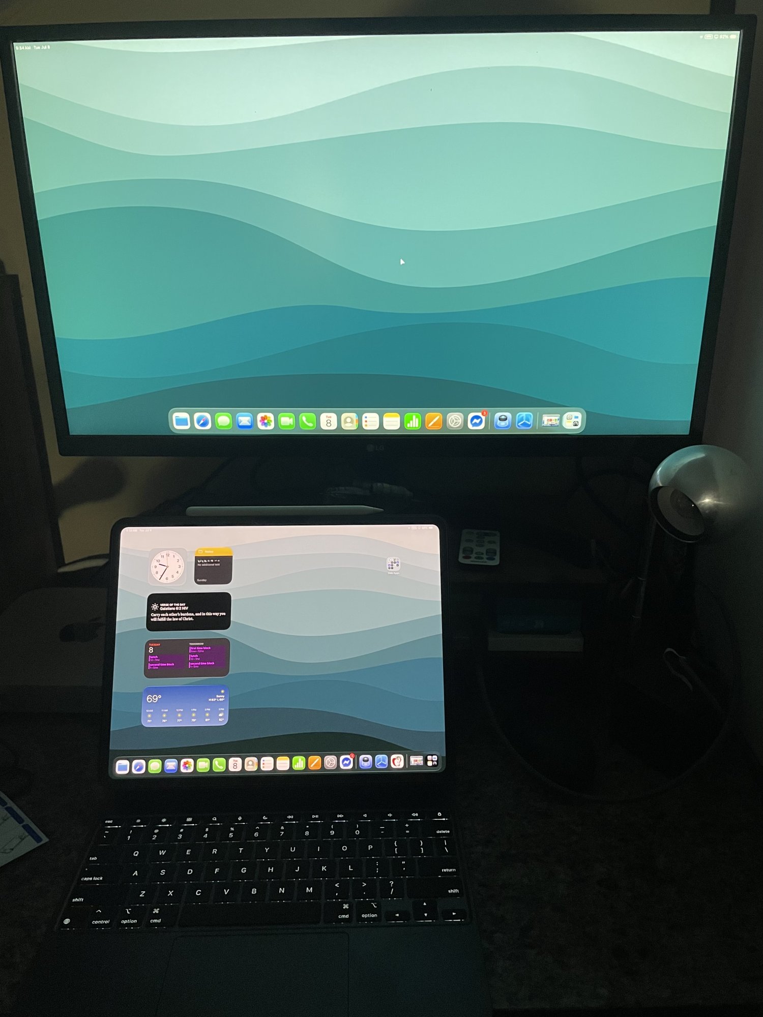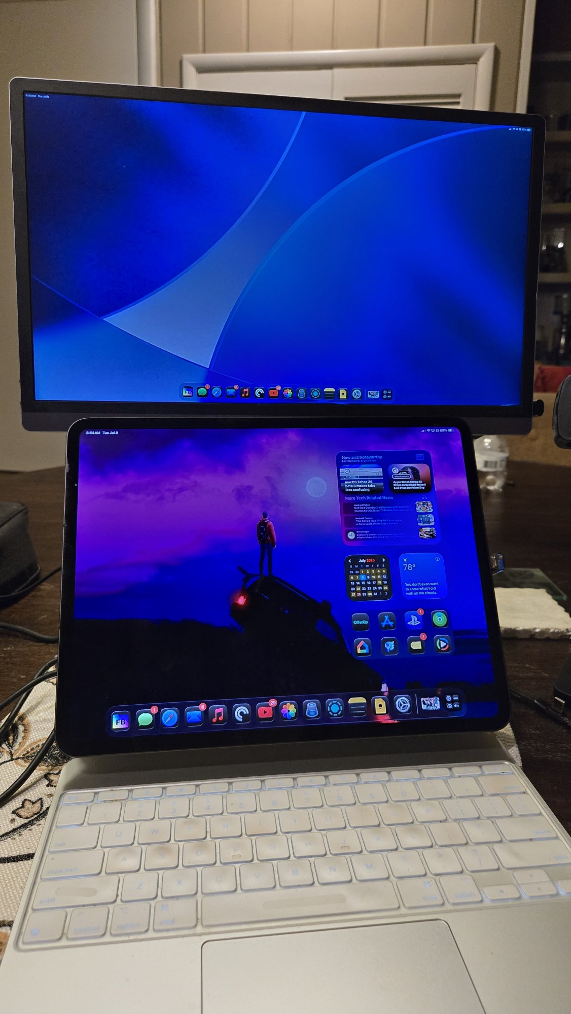 I’m not encountering that issue. I’m on Beta 3, and the desktop monitor is still working with my wallpaper. Perhaps a restart will fix it? 👍🏻. (PS. Lighting is weird in the photo, the two displays don’t look that different in reality, though the monitor is a bit dimmer than the display, possibly my brightness setting or something. 👍🏻)To those using the latest iPadOS 26 (beta 3)… have you experienced any bugs regarding wallpaper not displaying on external display?