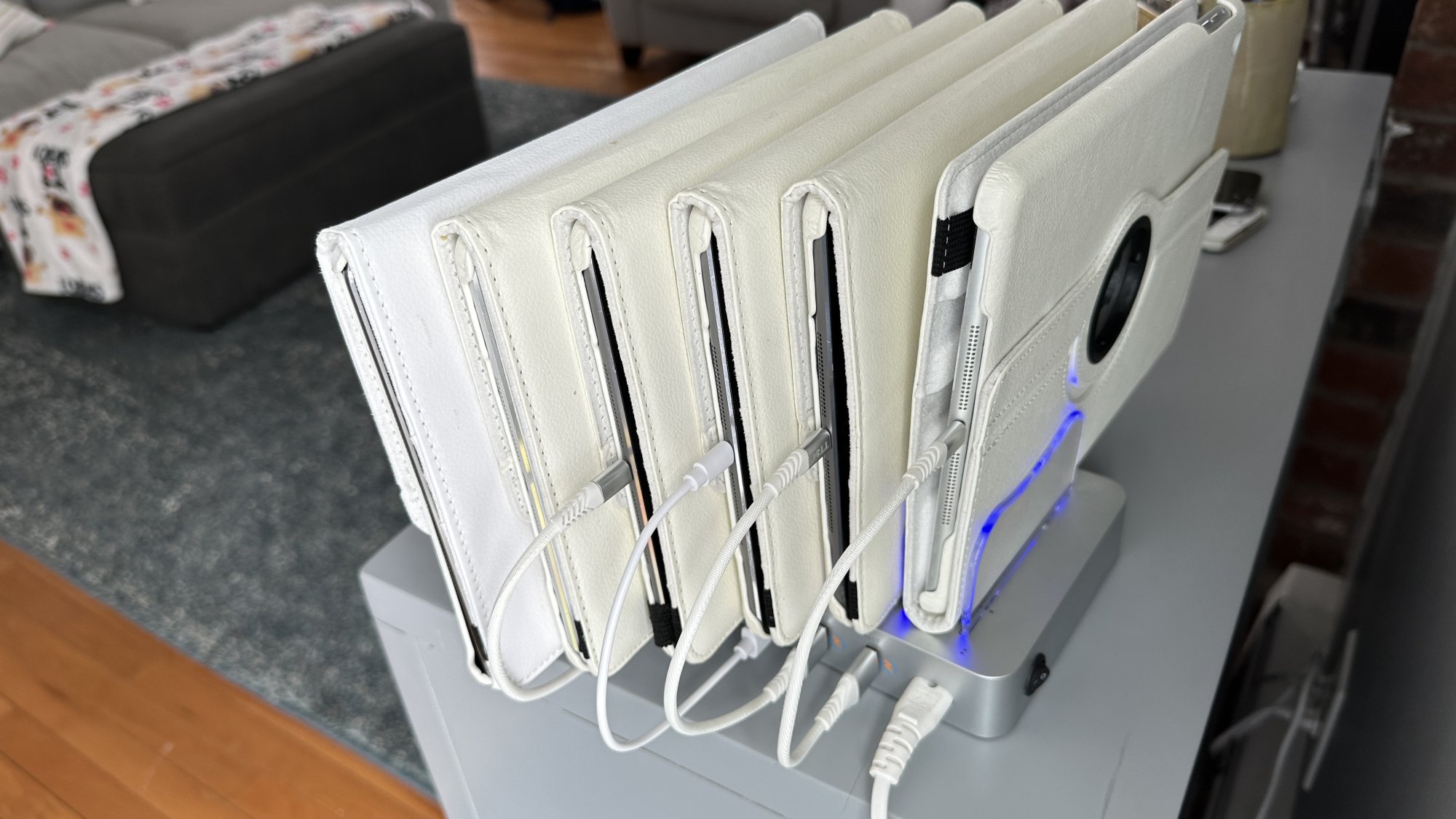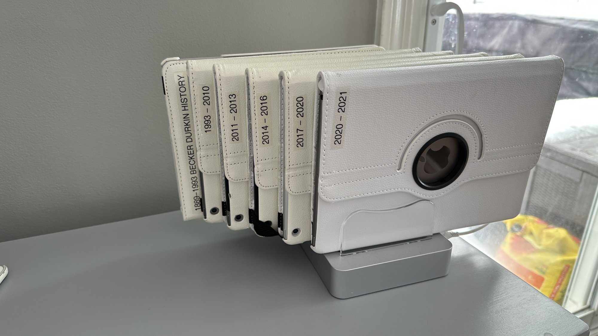 I have my iPads set up as separate photo albums by year. ( see pictures). I like to keep them plugged in all the time so people can come browse, but mostly they sit on the shelf unused, sometimes for months at a time.