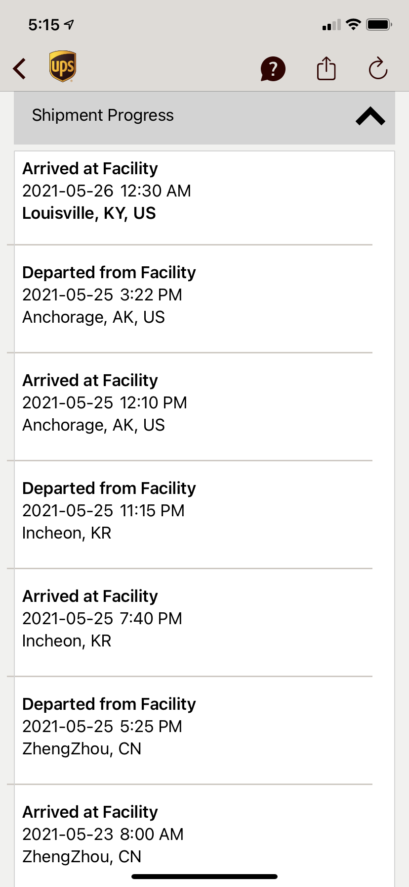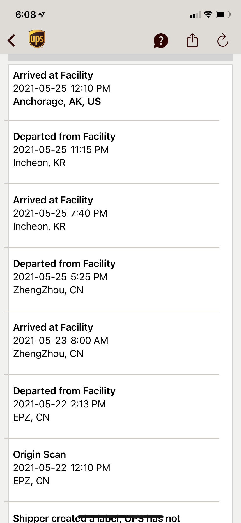 Hopefully yours just arrived in Incheon with mine, looks like they left a pallet by accident yesterday in ZhengZhou, and we're a day late (but a week ahead of Apple's promise date)Well so much for the missed scans theory. Thanks for nothing UPS.