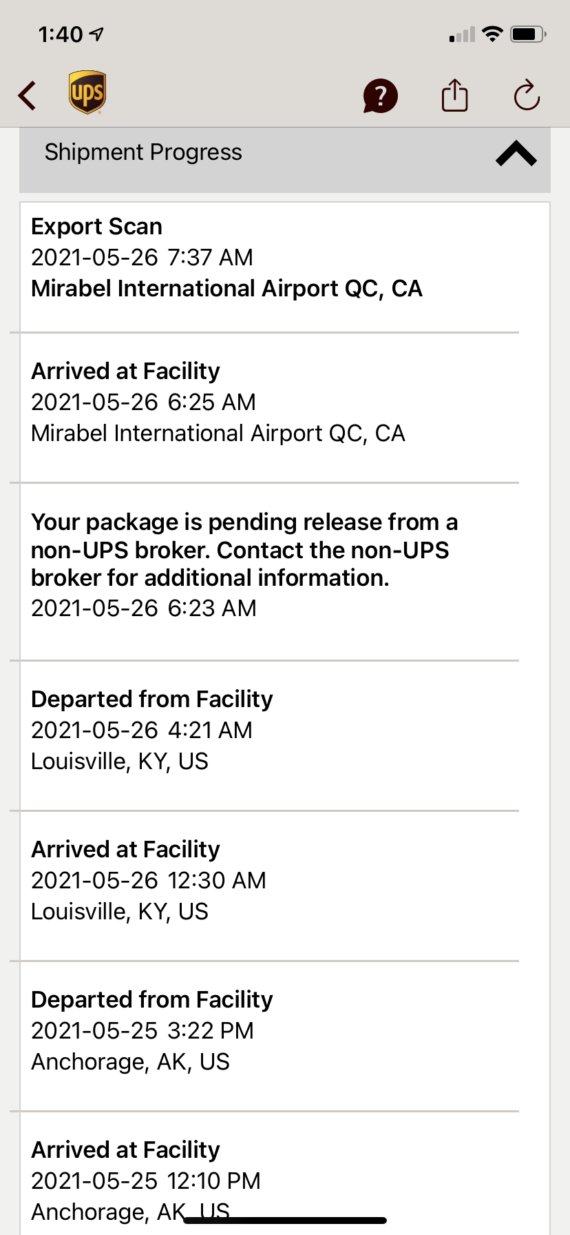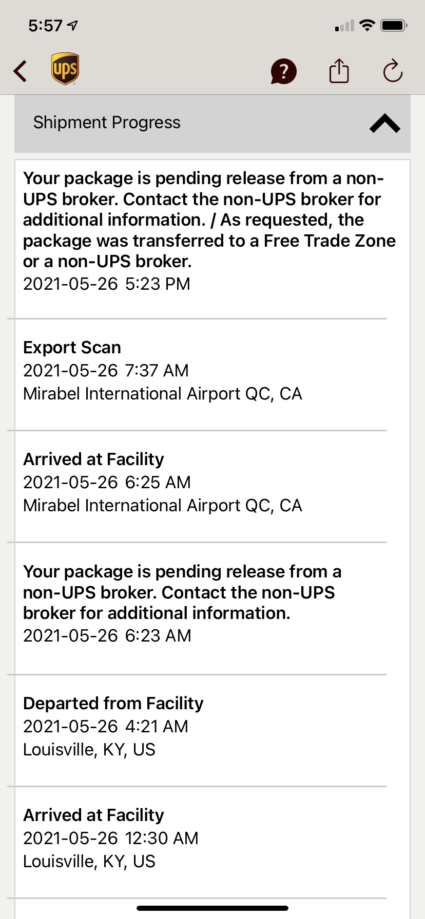 I don’t like this latest scan, and have no idea what it means. Maybe it’s something to do with clearing customs for entry into Canada. Also, my estimated delivery is no longer available. It has left Louisville, though, so not all is bad.