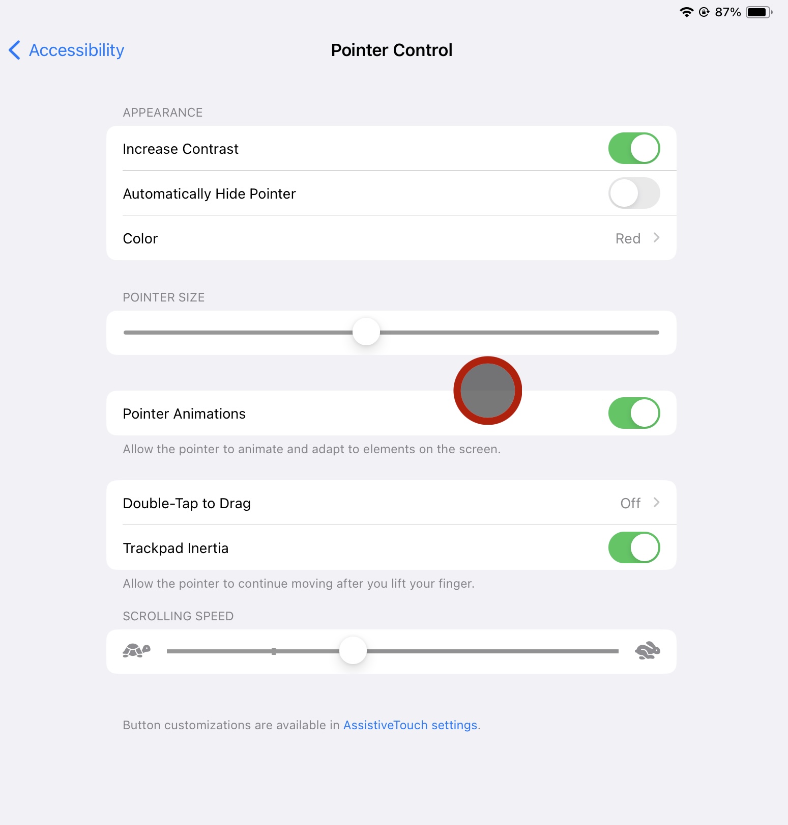 My daughter has switched from a laptop to iPad, but is struggling with the grey dot instead of having an arrow Pointer.