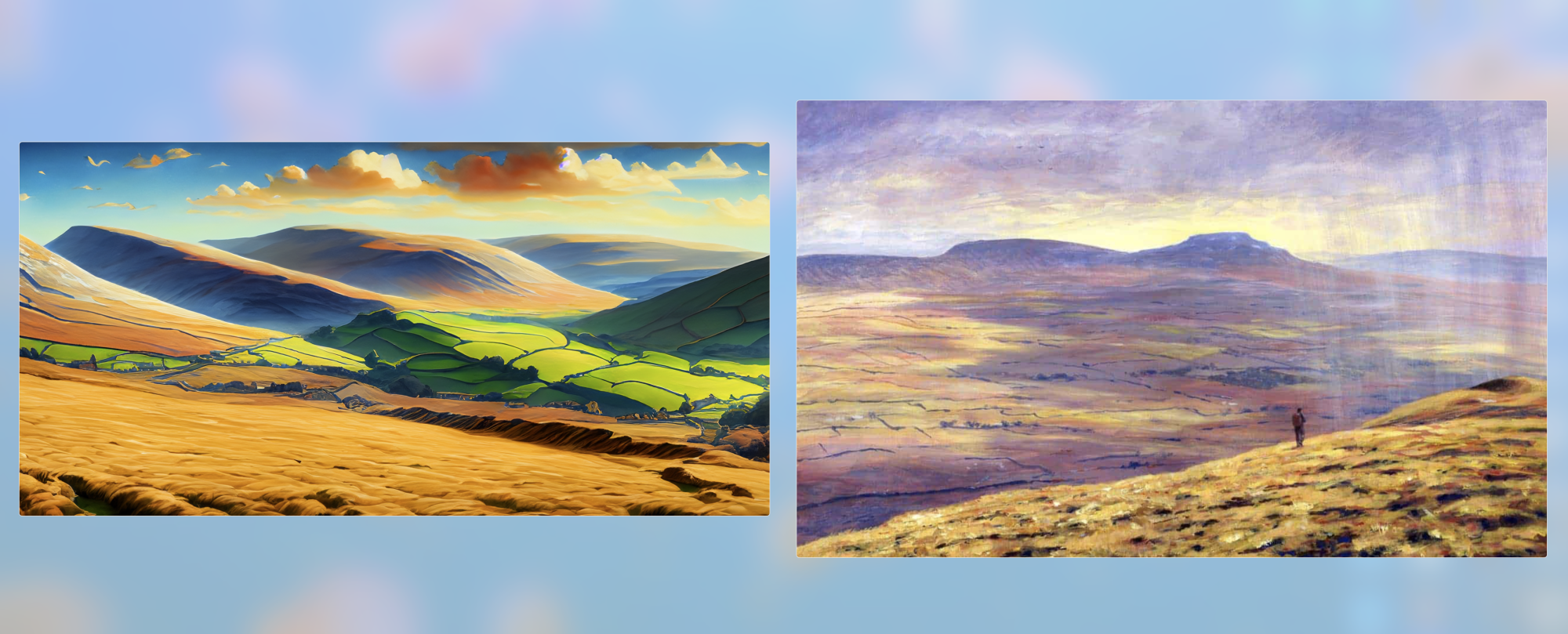Where I would draw the line with art is a completely generated by AI. Personally I am not a fan of digital art at all. Something about the human hand interacting with a piece. Chiseling stone, painting canvas, the effort and craftsmanship with no undo option. AI art lacks depth and meaning because AI has no depth and meaning, no life time of experiences. It is again algorithms and nothing more and no replacement for the human experience, only attempts at mimicking which makes it as conversational as a parrot. 2 images below, one is AI and one is painted by Keith Melling, an English artist. I think it is easy to spot what is AI and what is not. One has pretty colours and the uninformed might fight the bright colours to be enough, but there is no real looking into it, it is simply a place holder on a wall that is probably replaced with each new fad. The other is an artist, someone who has been to these places, inspired by them, lived in those hills, really sees the beauty and vastness of it all. AI will never replace real artists, though the masses may drink up the garbage art that AI spits out, just as over 300 million people think it is worth their time to follow the Kardashians on whatever platforms they are using. Ai is not the death of a culture, I would say that has already happened thanks to social media.