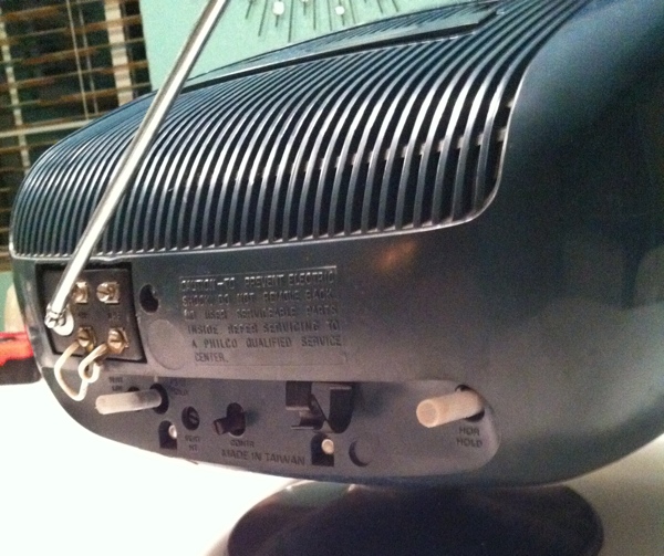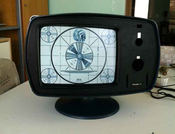 This TV started life out as a 1975 Philco B&W portable TV model B370FBL. It featured a 9" diagonal picture, and all of the manual controls that were standard for TV sets in the 70's. It had a curvy egg-shaped shell that seemed more suitable for the 1960's or maybe late 50's. It had very Jetson's-like qualities.