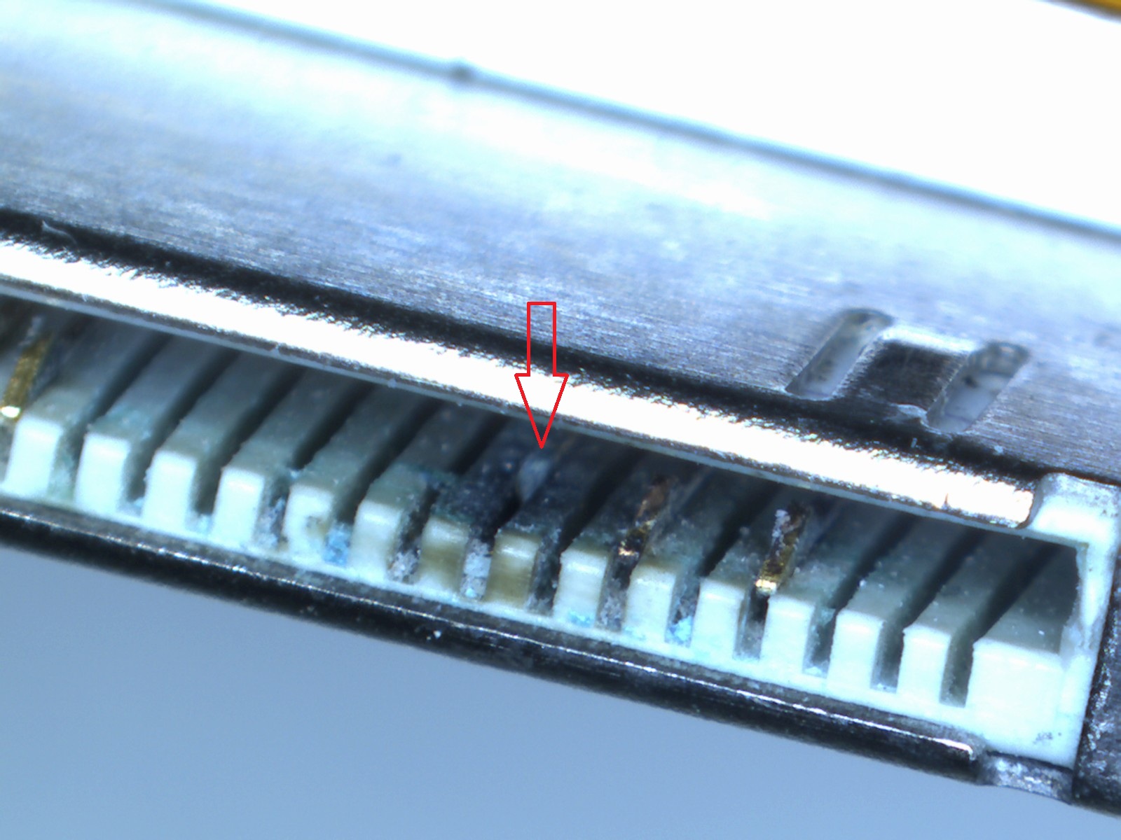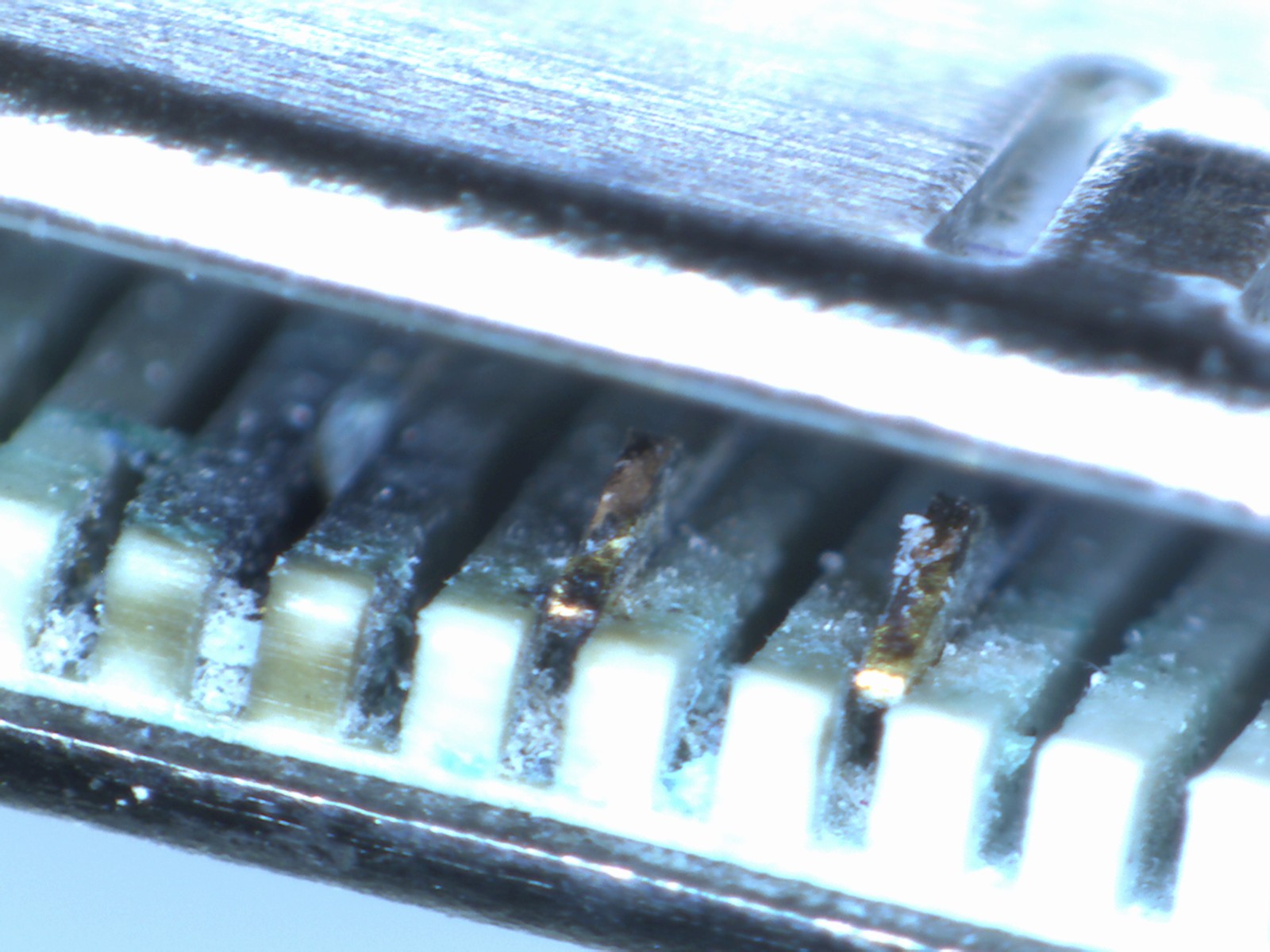 I have a 3rd gen iPad. Over the past year, I have had 3-4 charging cables stop working. When this happened recently, I decided to put one under the microscope to see what was going on. What I found was - in this particular case - one of the contacts had been burned away. I assume it exceeded it's per-pin current capacity. My suspicion is that when the iPad is low on charge, gets plugged in, and then continues to be used (rather than sits with the screen off) that the current draw is pretty high, and then, well, contacts get roasted. Check out the pictures, offer your opinions, and - most importantly - let me know if there is a superior aftermarket cable option out there.