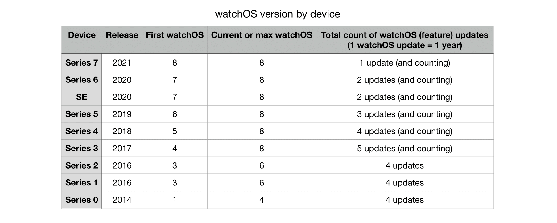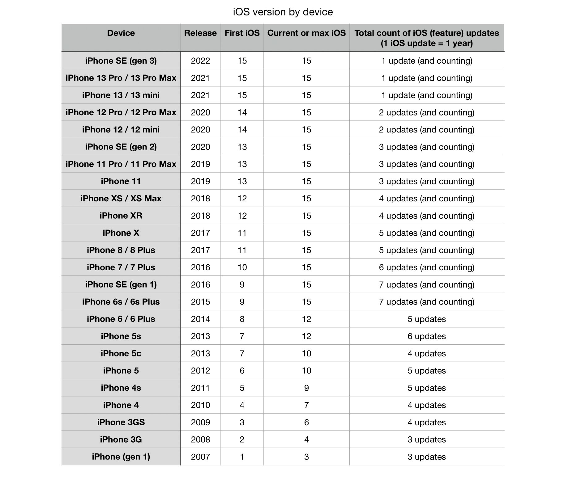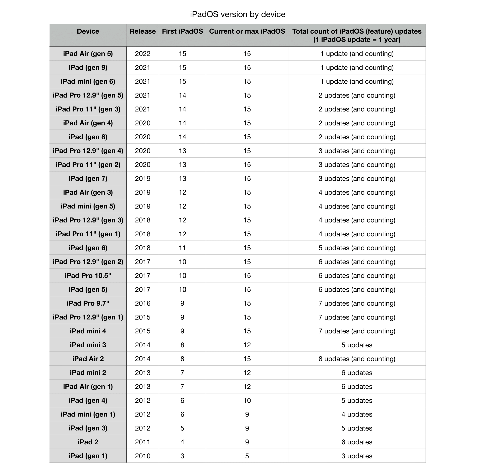 LOVE this chart - thanks for posting. I can't get over the iPad Air from 2014 - 8 years ago - still being updated.One thing is for sure, their (feature) update scheme is incredible: