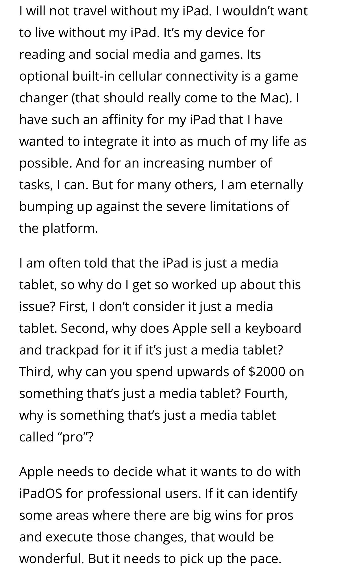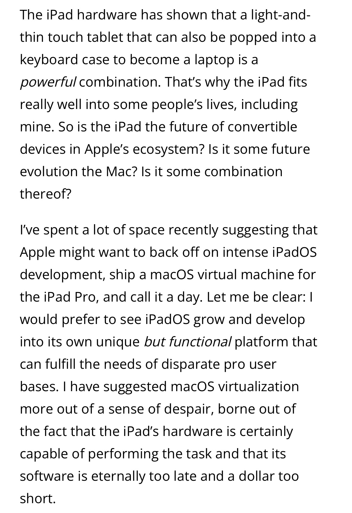 I’ve heard a lot of people say that if you don’t want macOS, you don’t have to use it and just stay on the iPadOS side of things. But that makes the erroneous conclusion that the presence of macOS wouldn’t affect those users. Developers will take the easy way out and just write mouse-based programs for macOS that would substitute for iPad apps. That would either deprive iPad users out of future iPad apps or would force those users into a touch-hostile environment, defeating the whole purpose of even buying an iPad. Lack of apps is what has stymied Android tablets. They have excellent hardware, too, but nobody buys them because there are no apps. The small niche users who want Mac apps would get what they want, but everyone else loses, eventually killing the iPad. Apple’s not going to sabotage the best tablet in the world by turning it into a bad hybrid. People think a hybrid is a panacea. If it were, Microsoft would dominate the tablet market with the unlimited apps Windows has. Instead, they flail with their Surface Pro line, forcing them to break their promise of Windows 10 being the last OS they’d ever make. It turns out Surface Pros are so compromised due to bad thermals and small battery that they end up being mediocre, underpowered laptops and horrible tablets since MS can’t convince any developers to optimize their apps for touch.
