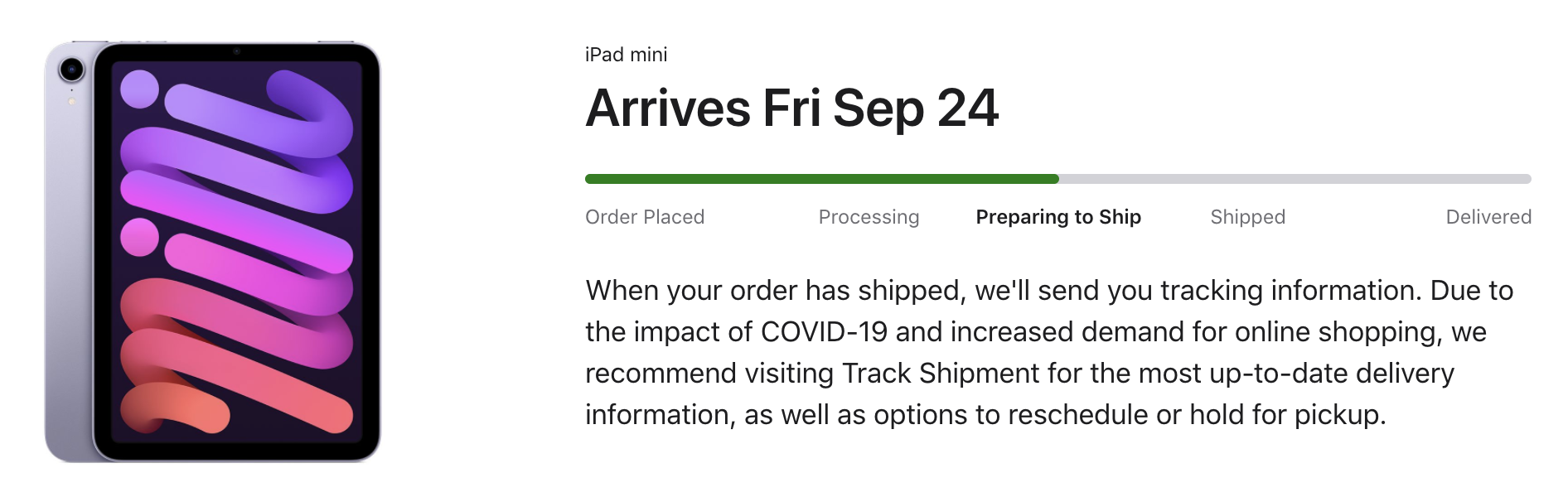 my order changed now to Arriving in September 24 and I can see it is on preparing shipment statusOrdered from apple.com just after the California Streaming event. 256GB Starlight 5G and mine still says "Arrives" with CC not yet charged when I checked few minutes ago.