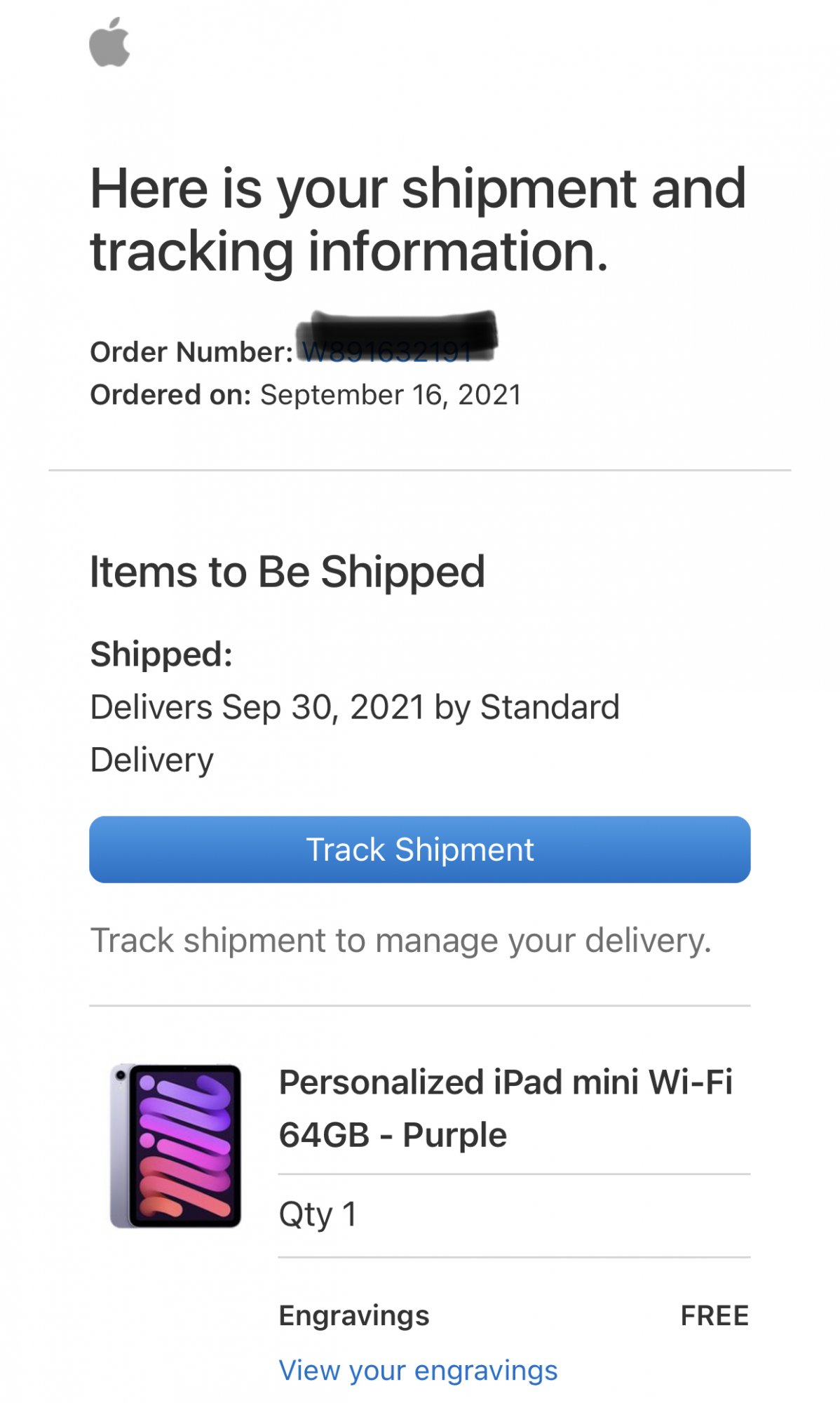 Order Placed:September 17, 2021